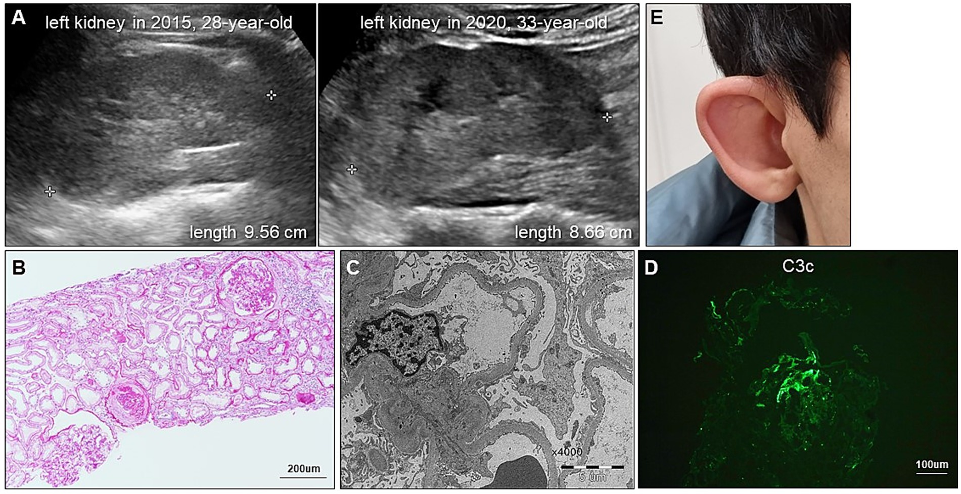 Figure 2. Renal and extrarenal manifestations of CAKUT in our patient. (A) Serial renal ultrasonography demonstrates progressive reduction in kidney size. (B) Periodic acid-Schiff staining shows global and segmental glomerulosclerosis and tubular injury with immune cell infiltration. (C) Electron micrograph shows diffuse foot process effacement without electron-dense deposits. (D) Immunofluorescence staining for C3 shows segmental granular deposits, regarded as nonspecific trapping in sclerotic areas. (E) Photograph displays a dysmorphic external ear with an underdeveloped auricle, consistent with microtia.
