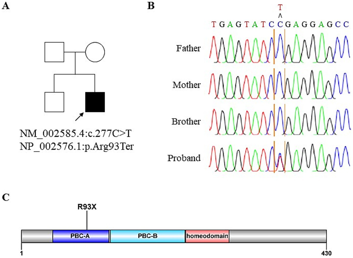 Figure 3. Identification of novel PBX1 variant. (A) Pedigree of the affected individual. (B) Sanger sequencing confirms de novo PBX1 variant in the patient. Blood samples from the patient and his family are used for Sanger sequencing. (C) Schematic of the PBX1 protein with a PBX1 variant in the proband.