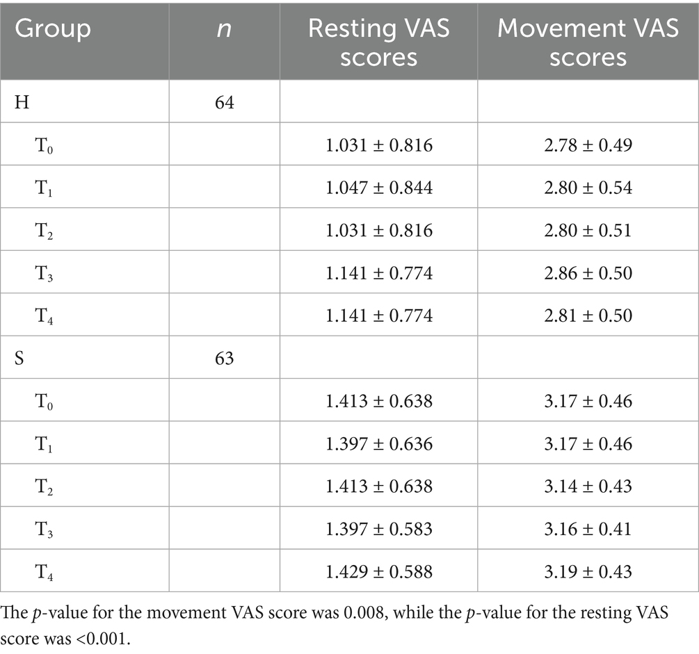 The differences in postoperative resting and movement VAS scores between groups were statistically significant (Table 1).