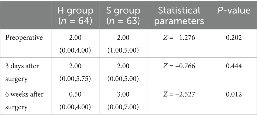 Intergroup comparison revealed no statistically significant differences in BAI scores both at baseline (p = 0.202) and on postoperative day 3 (p = 0.444). However, at 6 weeks postoperatively, the BAI scores in the H group were substantially lower than those in the S group, with a significant difference (p = 0.012), as shown in Table 4.
