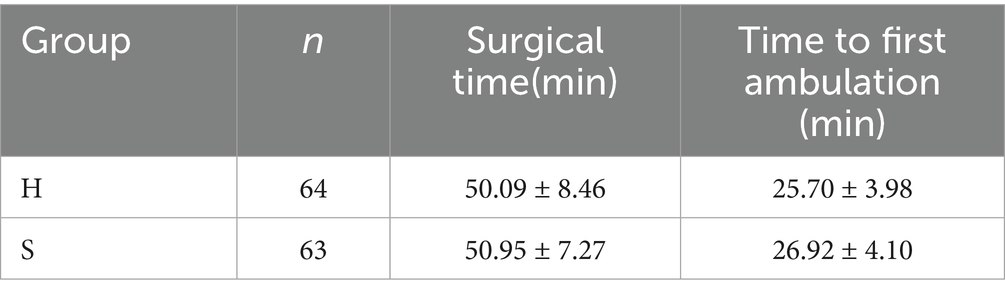 3.4 Comparison of surgical time and time to first ambulation between the two groups