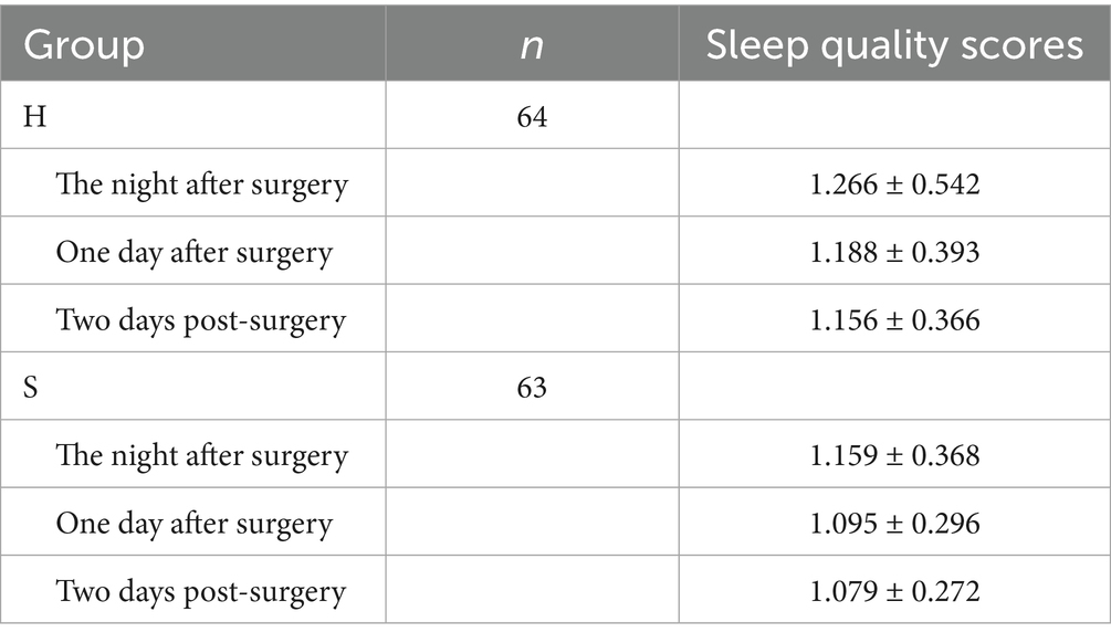 Surgical time and time to first ambulation were recorded. Sleep quality scores were assessed on the night of surgery and on the first and second days after surgery. The sleep quality scoring criteria were good sleep (1 point), restless sleep (2 points), nightmares (3 points), and insomnia (4 points).
