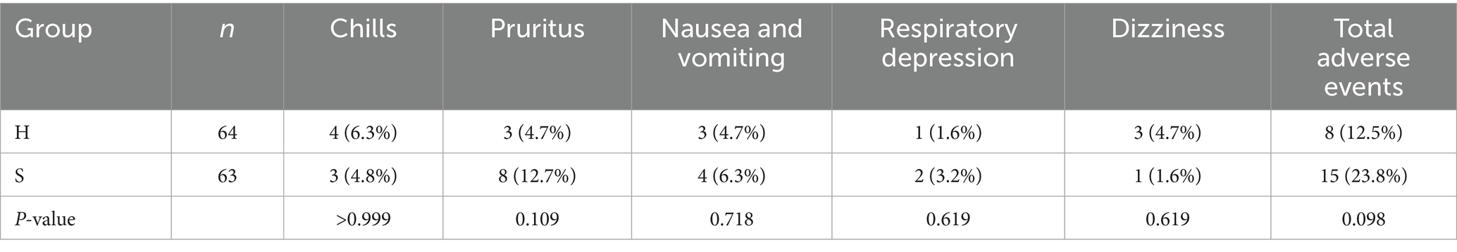 While effective for pain relief, opioids may induce adverse effects, including nausea, vomiting, pruritus, and respiratory depression (13, 28, 32). HM PCIA was associated with higher incidences of pruritus and nausea compared to sufentanil PCIA, but no significant differences were observed between the two groups in terms of vomiting, respiratory depression, or dizziness (13). Similarly, in our study, there were no statistically significant differences in the incidence of vomiting, respiratory depression, or dizziness between the H and S groups, and the overall incidence of postoperative complications was similar. However, HM PCA demonstrated lower incidences of nausea, vomiting, drowsiness, and pruritus compared to sufentanil PCA (28). In our study, the similar rates of nausea, vomiting, pruritus, respiratory depression, and dizziness between the H and S groups may be attributed to the reduced concentration of HM when combined with sufentanil. Therefore, further research is required to investigate various concentrations of HM combined with sufentanil for postoperative analgesia to minimize adverse effects.