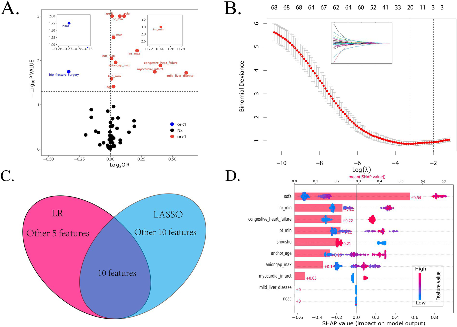 A total of 308 patients from the MIMIC database were included for model derivation in this study. The patients were divided into training and internal validation groups using completely randomized sampling, with a ratio of 3:1. No statistically significant differences were found between the training cohort and internal validation (testing) cohort in most terms. The baseline characteristics of the patients are presented in Table 1. The baseline characteristics of these patients, comparing the survival and non-survival groups, are presented in Supplementary Table S3, where a significant difference is observed. In addition, 67 patients from eICU-CRD were extracted as the external validation cohort, with nine dead cases and 58 survivors. The baseline characteristics of the patients between the MIMIC and eICU-CRD cohorts are shown in Supplementary Table S4. The usage of anticoagulant and antiplatelet drugs among all patients in the training set is depicted in Supplementary Figure S1A. We also compared the usage of anticoagulant and antiplatelet drugs between the MI and non-MI groups in the training set (Supplementary Figure S1B).