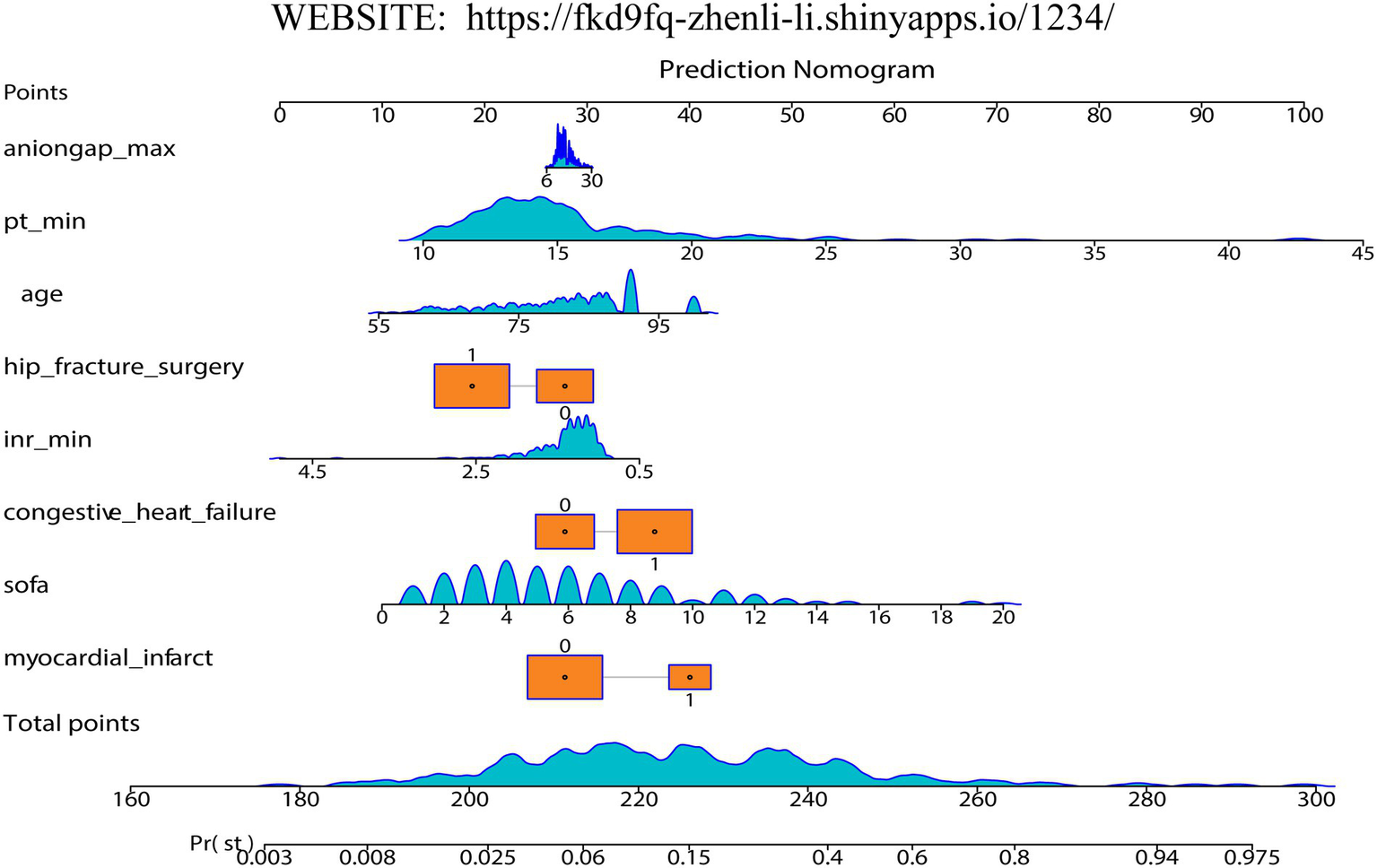 Moreover, AF is a common arrhythmia during the perioperative period, which is related to poor outcomes. Adunsky et al. demonstrated that 1-year mortality in older adult patients undergoing hip fracture repair is significantly increased in patients with postoperative AF (15). Leibowitz et al. also demonstrated a high correlation between perioperative AF and 1-year mortality in older adult hip fracture patients. In-hospital mortality of older adult hip fracture patients has been explored in several studies, which is a critical induce reflecting the treatment effect (16, 17); for example, a recent study demonstrated the risk factors of in-hospital mortality for hip fracture patients with AF nationwide, mainly involving sepsis, respiratory failure, liver disorders, and acute kidney injury (5). In addition, the effort to develop prognostic models for older adult hip fracture groups has also been made. For example, Fu et al. developed a nomogram-based model to predict the preoperative AF among older adult patients with HF, and Lu et al. also constructed a nomogram-based model to predict the short-term mortality in older adult hip fracture patients with complicated heart failure in an ICU (18, 19). Nevertheless, few studies have identified the risk factors of in-hospital all-cause mortality for older adult patients with hip fractures complicated by AF from an ICU cohort and developed a dynamic predictive and visual tool for clinical use.
