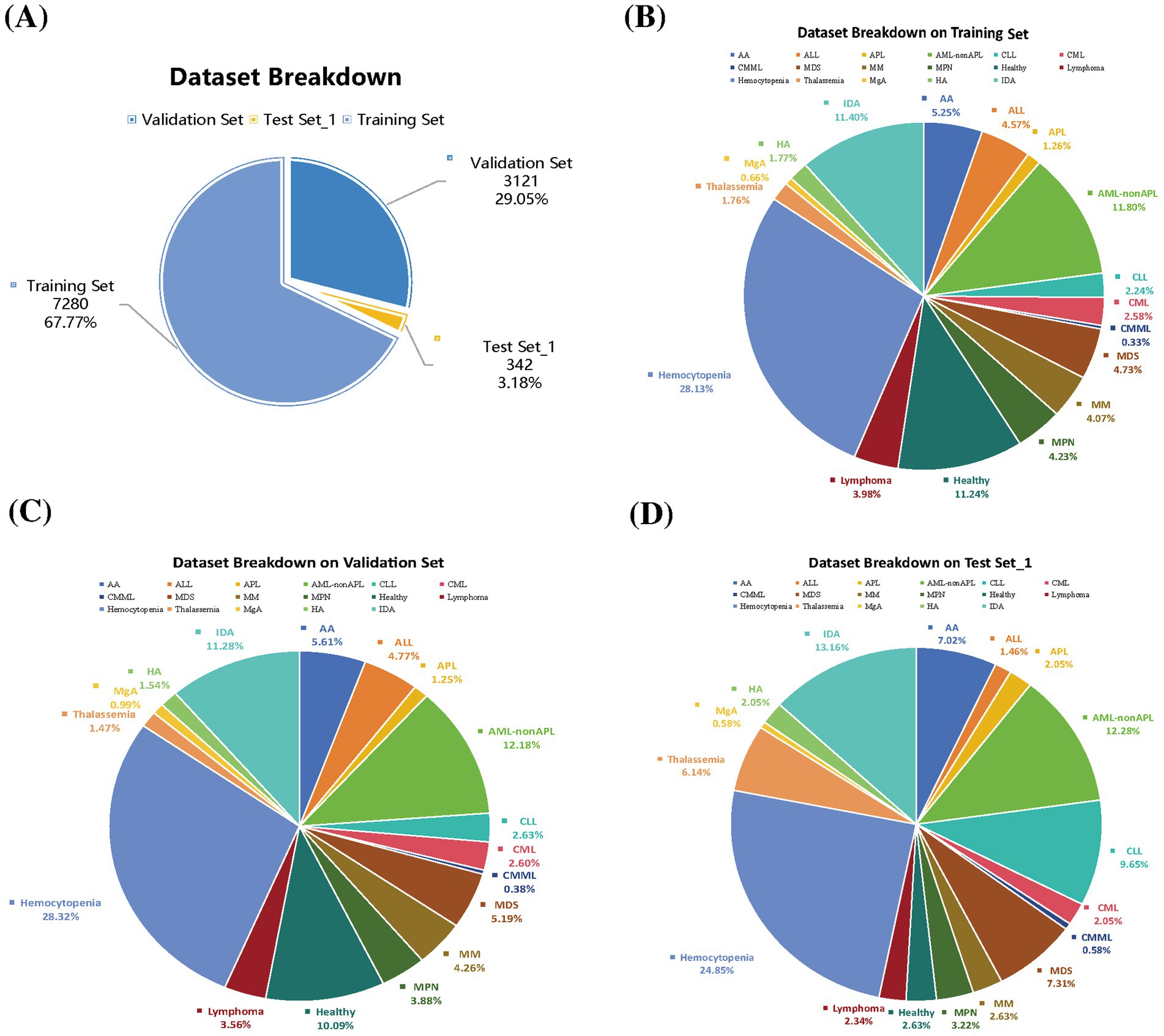 (A) A pie chart showing the internal dataset breakdown: training set at 67.77%, validation set at 29.05%, and test set_1 at 3.18%.(B) A pie chart of the training set composition, highlighting Hemocytopenia (28.13%), AML-nonAPL (11.80%), and IDA (11.40%) as major components.(C) A pie chart of the validation set, with Hemocytopenia at 28.32%, AML-nonAPL at 12.18%, and IDA at 11.28%.(D) A pie chart of the test set_1, showing Hemocytopenia at 24.85%, AML-nonAPL at 12.28%, and IDA at 13.16%.