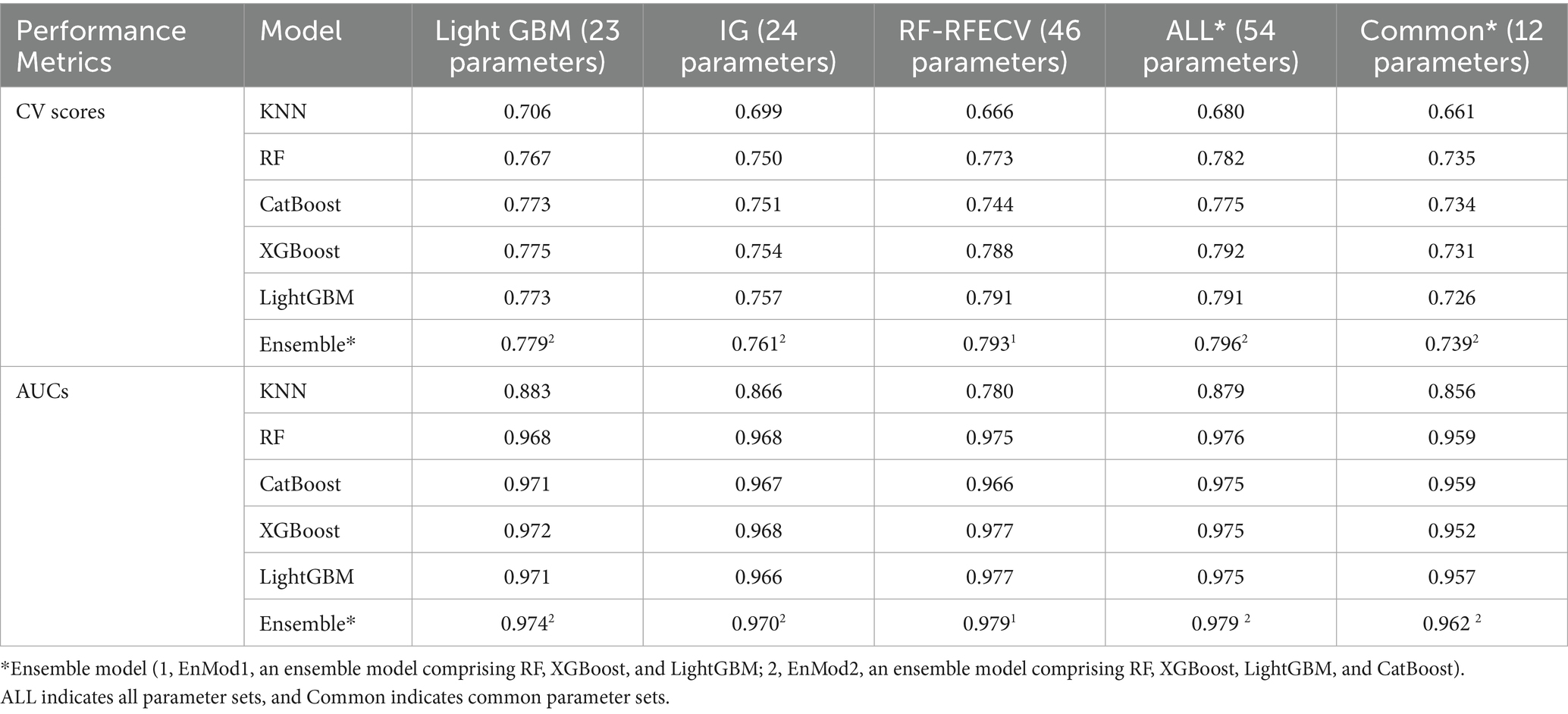 We assessed the performance of our model using accuracy and AUC as the primary evaluation metrics. On the validation set, the model with 54 parameters achieved a CV score of 0.796, while EnMod1-46, which was developed using the RF-RFECV method to select 46 parameters, achieved a slightly lower CV score of 0.793. Both models demonstrated identical AUC values of 0.979, indicating comparable predictive capabilities. While the performance of the two models was nearly equivalent, EnMod1-46 utilized fewer features, thereby reducing computational costs and minimizing dependence on parameters. Based on this analysis, we selected the 46-parameter EnMod1-46 as our final model. At the same time, EnMod2-12, which was constructed using a simplified parameter set of 12 features, achieved a CV score of 0.739 and an AUC of 0.962. Although its accuracy was lower than that of EnMod1-46, EnMod2-12 offered a practical advantage by requiring fewer and more easily obtainable parameters. Table 1 presents the CV scores and AUCs of different feature subsets across the models.