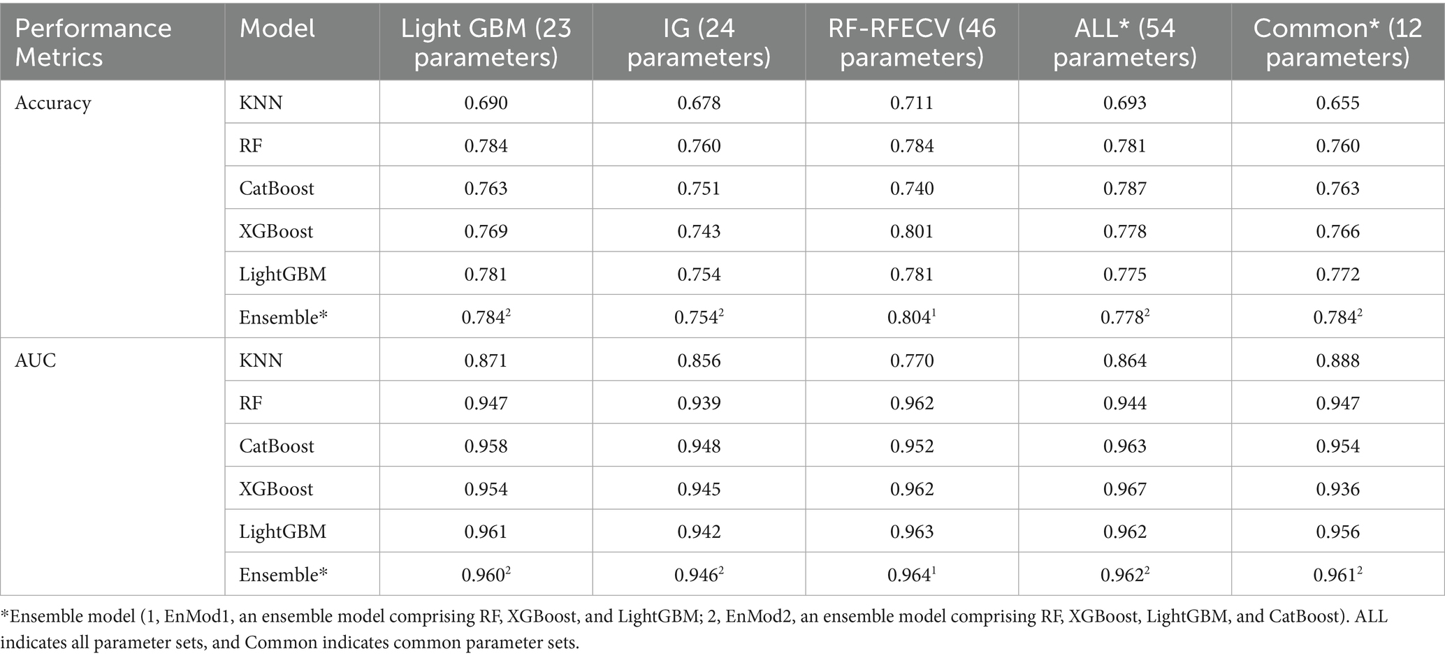 Table 2. The accuracy and AUC for different models and parameter sets on the test set_1.