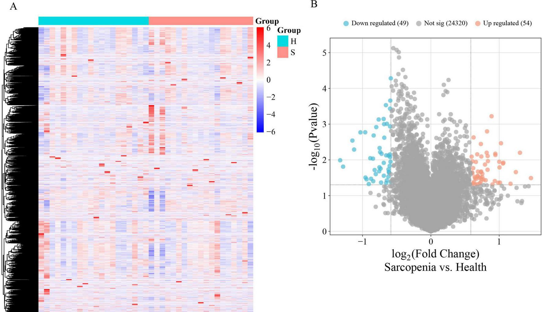 The mRNA expression dataset GSE226151 was normalized, revealing 103 DEGs between sarcopenia and healthy controls, with 54 up-regulated and 49 down-regulated. Figures 2A,B display a heatmap and volcano plot, respectively.
