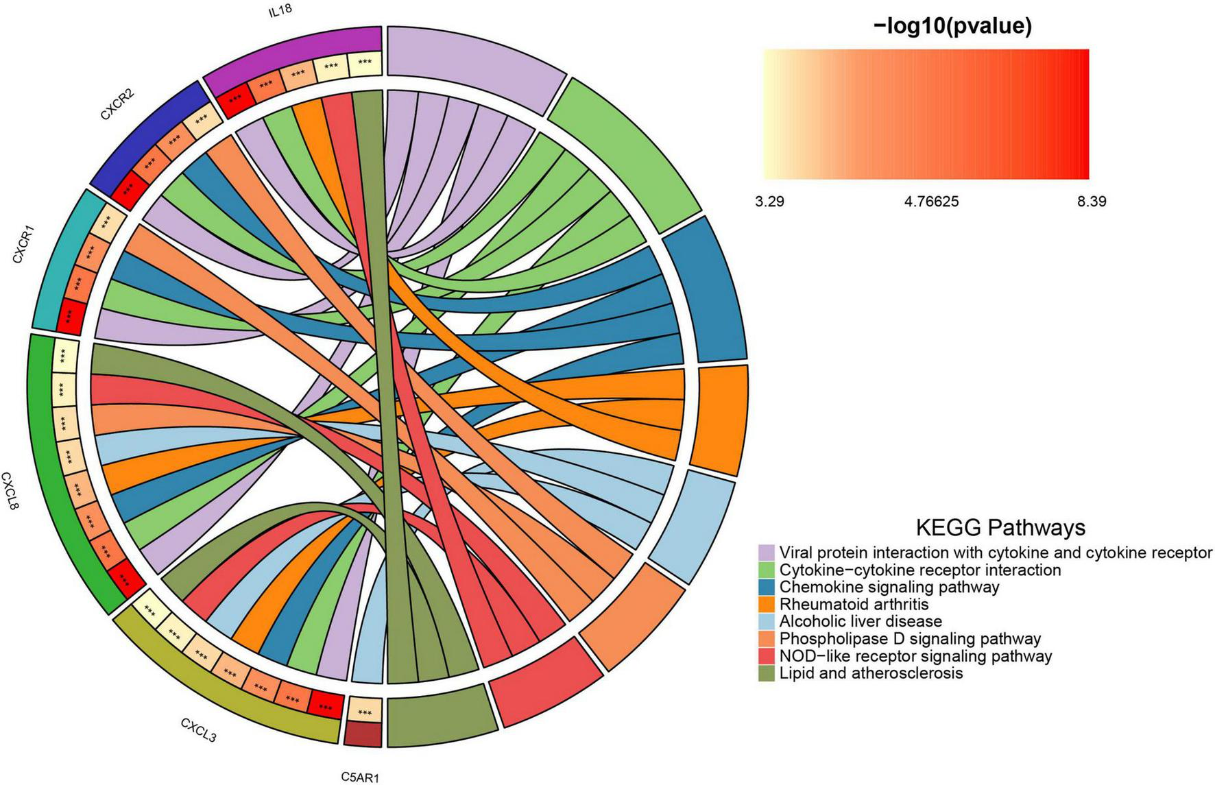 Supplementary materials 1, 2 list 396 chemokine-related and 73 NETosis-related genes. From the GSE226151 dataset, six DECRGs and three DENRGs were identified by intersecting DEGs with chemokine and NETosis-related genes, respectively (Figure 4A). The results of the DO enrichment analyses are depicted in Figure 4B, demonstrating that these seven DECRGs and DENRGs are enriched in several diseases closely associated with sarcopenia, such as abdominal obesity-metabolic syndrome, lipid metabolism disorder, non-alcoholic fatty liver disease, lipodystrophy, tuberculosis, hyperglycemia, leukocyte disease, kidney failure, pancreas disease, vitamin D-dependent rickets, and inflammatory bowel disease. KEGG pathway analysis shows these genes are mainly linked to cytokine-cytokine receptor interaction, chemokine signaling, NOD-like receptor signaling, and viral protein interaction with cytokines, indicating their potential role in immune response regulation and neutrophil chemotaxis (Figure 5).