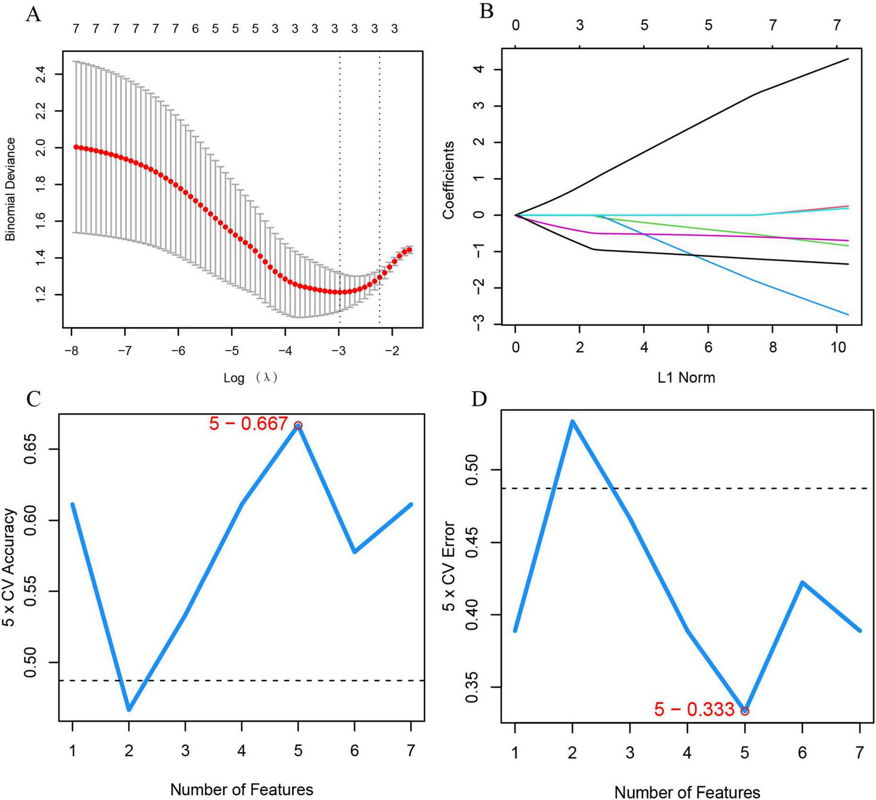 Machine learning for selecting feature genes from DECRGs and DENRGs. (A) Optimal log (λ) value is chosen via 10-fold cross-validation and shown by partial likelihood deviance; (B) LASSO regression identifies variables and maps them to curves; (C) maximum accuracy (5 × CV) of 0.667 is achieved with five feature genes; (D) minimum error (5 × CV) of 0.333 occurs with five feature genes.