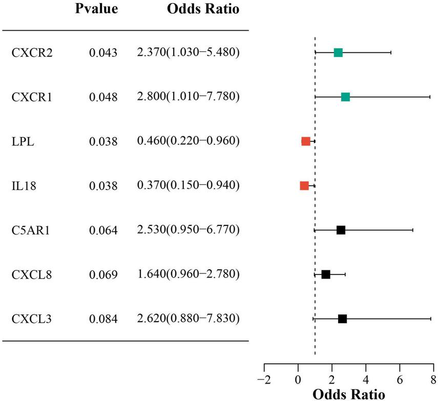 Univariate logistic regression showed that higher CXCR2 and CXCR1 expression increased sarcopenia risk, while lower LPL and IL18 expression was protective. Figure 7 presents forest plots that illustrate the risk factors identified through univariate analysis.