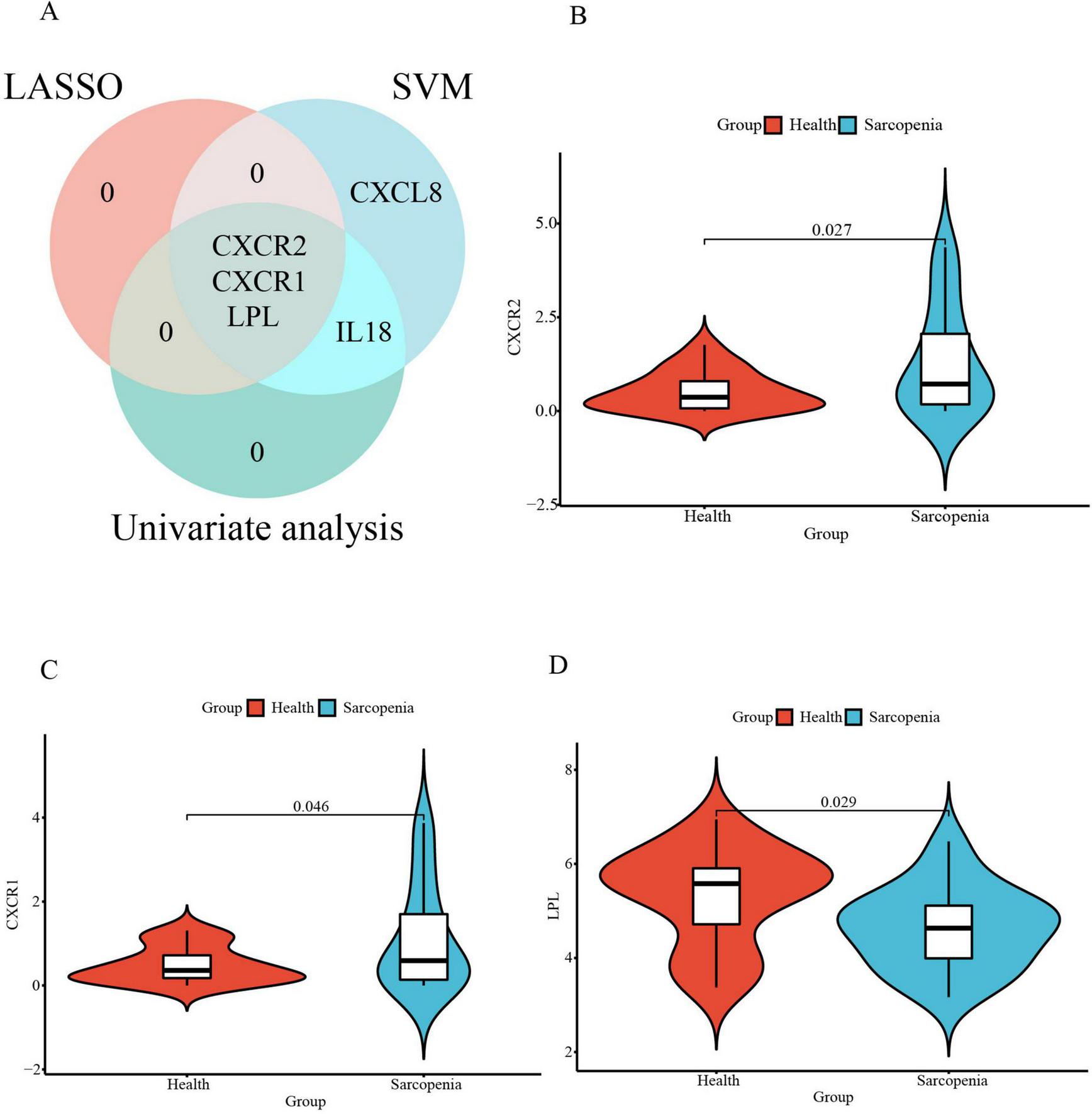 (A) The Venn diagram for recognizing signature genes; The violin plot of mRNA expression CXCR2 (B), CXCR1 (C), and LPL (D) in GSE226151 between sarcopenia and healthy control groups.