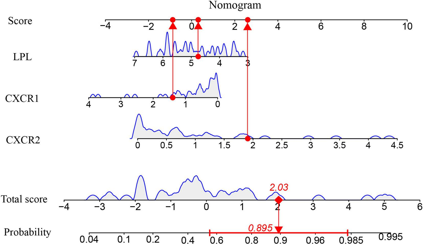 The Nomogram model for predicting sarcopenia from healthy controls based on three signature genes.