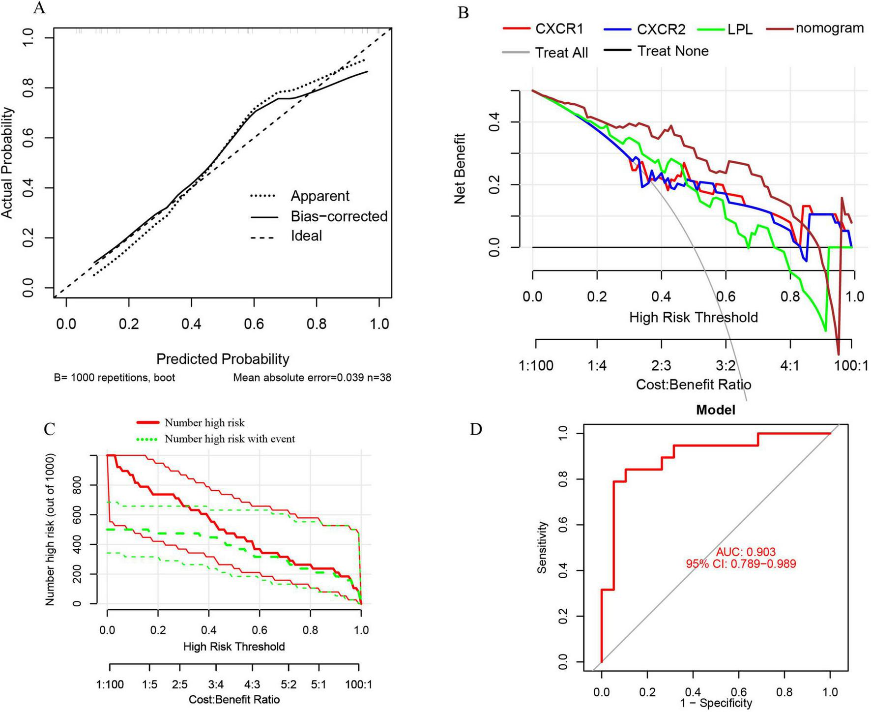 Diagnostic models with nomograms were created using signature genes via the R rms package. Calibration was assessed with calibration curves, using mean absolute error and 1,000 bootstrap samples through the R CalibrationCurves package. Decision curve analysis (DCA) evaluated the nomograms’ net benefits at various risk thresholds, and the clinical impact curve (CIC) assessed predictive efficacy. Model performance was analyzed using ROC curves and AUC. A similar nomogram model was developed and validated in an internal validation group.