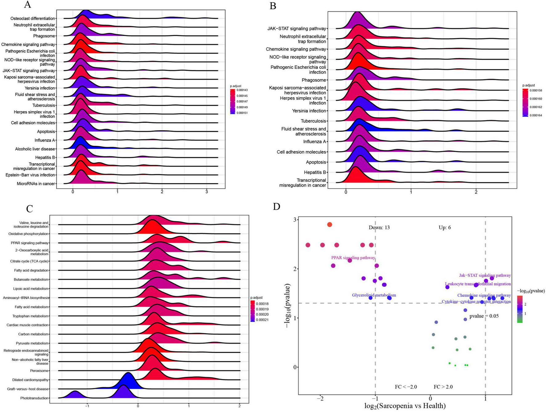(A) Top 20 KEGG pathways from single-gene GSEA of CXCR2; (B) top 16 KEGG pathways from single-gene GSEA of CXCR1; (C) top 20 KEGG pathways from single-gene GSEA of LPL; (D) GSVA-based volcano plot of pathways between sarcopenia and healthy controls.