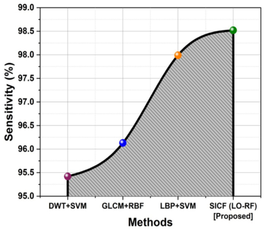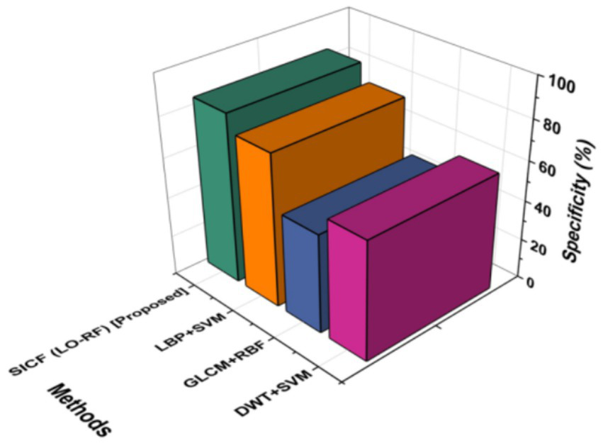 Our results also demonstrate that multiscale feature fusion, enhanced contrast preprocessing, and automated ROI extraction contribute to improved differentiation of tumor subtypes—a task that is often hindered by inconsistent image quality or anatomical variability. While deep CNN—only models risk overfitting on small datasets, fusing handcrafted and deep features appeared to mitigate this limitation, aligning with observations from prior multi-modal imaging studies (13, 17). Compared with previously reported accuracies ranging from 72% to 89% for classical ML and deep learning methods, our framework achieved higher sensitivity (98.52%) and solid specificity (84.59%), indicating robust discriminative capability.