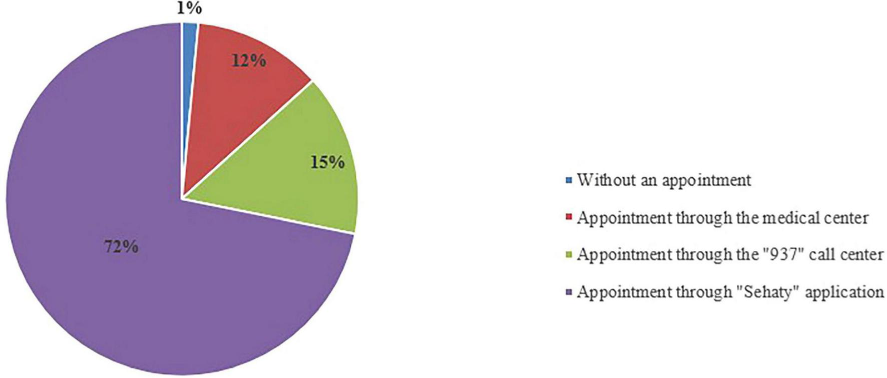 A total of 106,168 responses from patients who visited the selected PHCCs received the survey; however, only 81,211 participants (76.5%) completed the patient experience survey. Most of the participants (72%) booked their appointment via the Sehaty application, an MOH unified platform that allows users to access health services, as shown in Figure 2. An additional 15% of the respondents booked their PHC appointment via the 937 MOH Call Center (23).