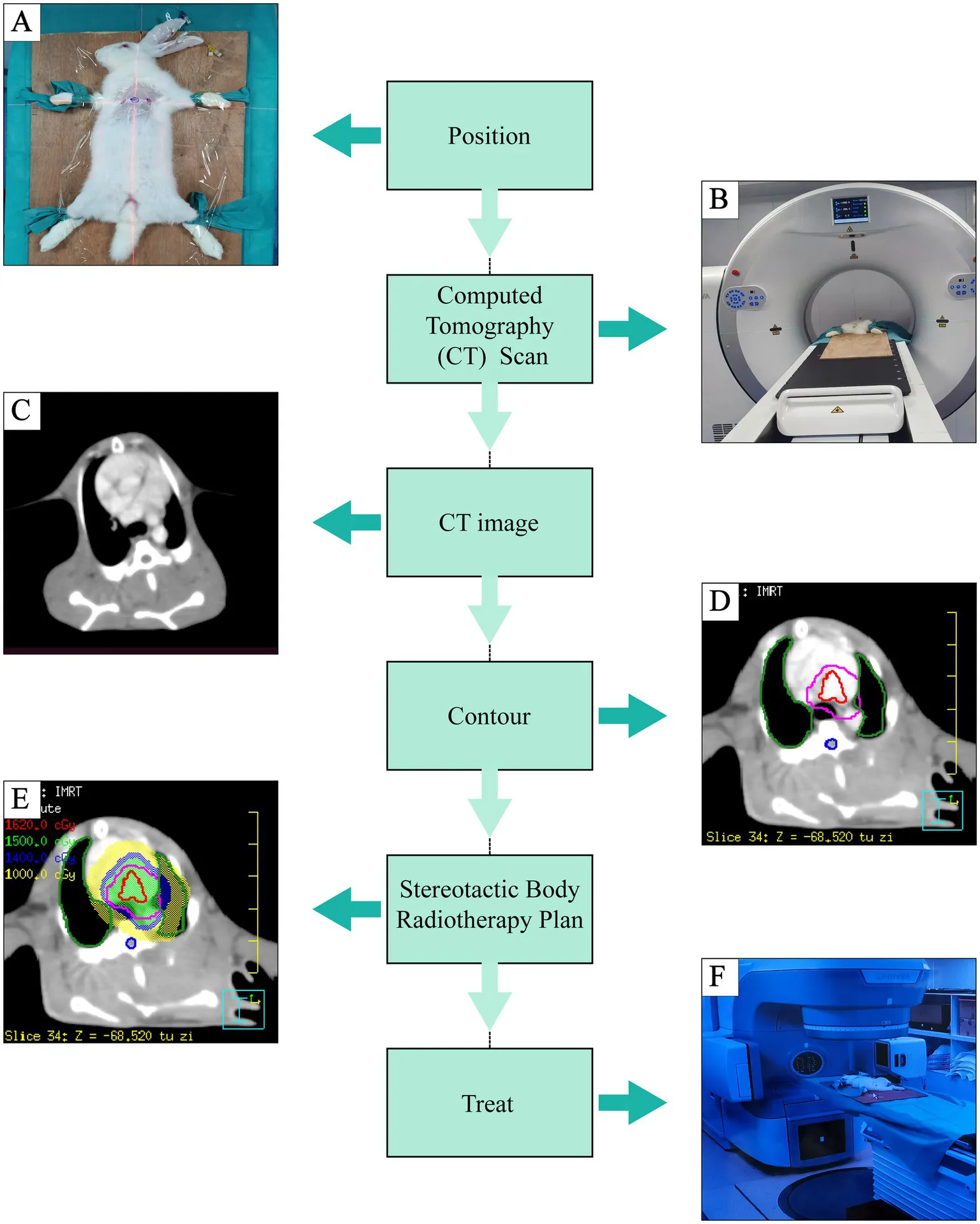 All rabbits were fixed in supine position and underwent positioning scan by large aperture computed tomography (CT) simulator (Shinva Medical Instrument, Shandong, China). The CT reference points were marked on the skin with three metallic radiopaque markers at the level of PA using wall-mounted lasers. Rabbit’s body was hold by sticky tapes to minimize movement during anesthesia. Contrast medium (iomeprol 350 mg I/ml, 2 mL/kg) was injected through a cannulated ear vein to enhance scans and identify the PA (20-s delay, flow rate 0.2 mL/s). After PA enhanced CT, all images were imported to a data management workstation to outline the circumferential areas around the left and right pulmonary arteries to determine clinical target volume (CTV). To account for setup and radiation delivery uncertainties, an isotropic 2-mm expansion on CTV was used to determine the planning target volume (PTV). Adjacent organs at risk (OARs), such as spinal cord and lungs, were delineated to protect them from radiation. SBRT radiation treatment plan was generated in the Philips pinnacle treatment planning system (TPS) to deliver a single fraction irradiation of 15 Grey (Gy) to the PTV. The treatment was delivered using an image-guided radiotherapy-equipped XHA1400 system (Shinva Medical Instrument, Shandong, China). Rabbits in the SBRT group underwent treatment and were bred for a minimum of 3 months (19, 21, 22, 24, 25). The procedure workflow was shown in the Central Illustration.