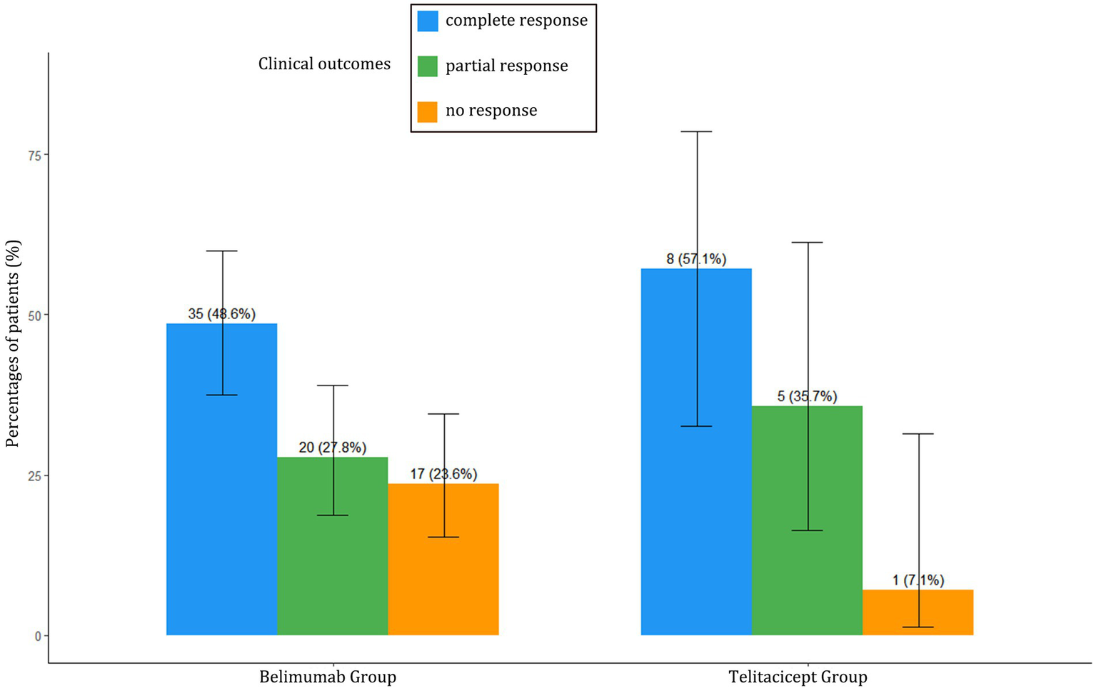 Despite having more severe baseline disease, the BAFF/APRIL-guided telitacicept group achieved better clinical outcomes at 6 months compared to the conventional belimumab group (Table 2). The telitacicept group demonstrated a higher complete response rate (57.1% vs. 48.6%) and partial response rate (35.7% vs. 27.8%), with a substantially lower non-response rate (7.1% vs. 23.6%) (Figure 1).