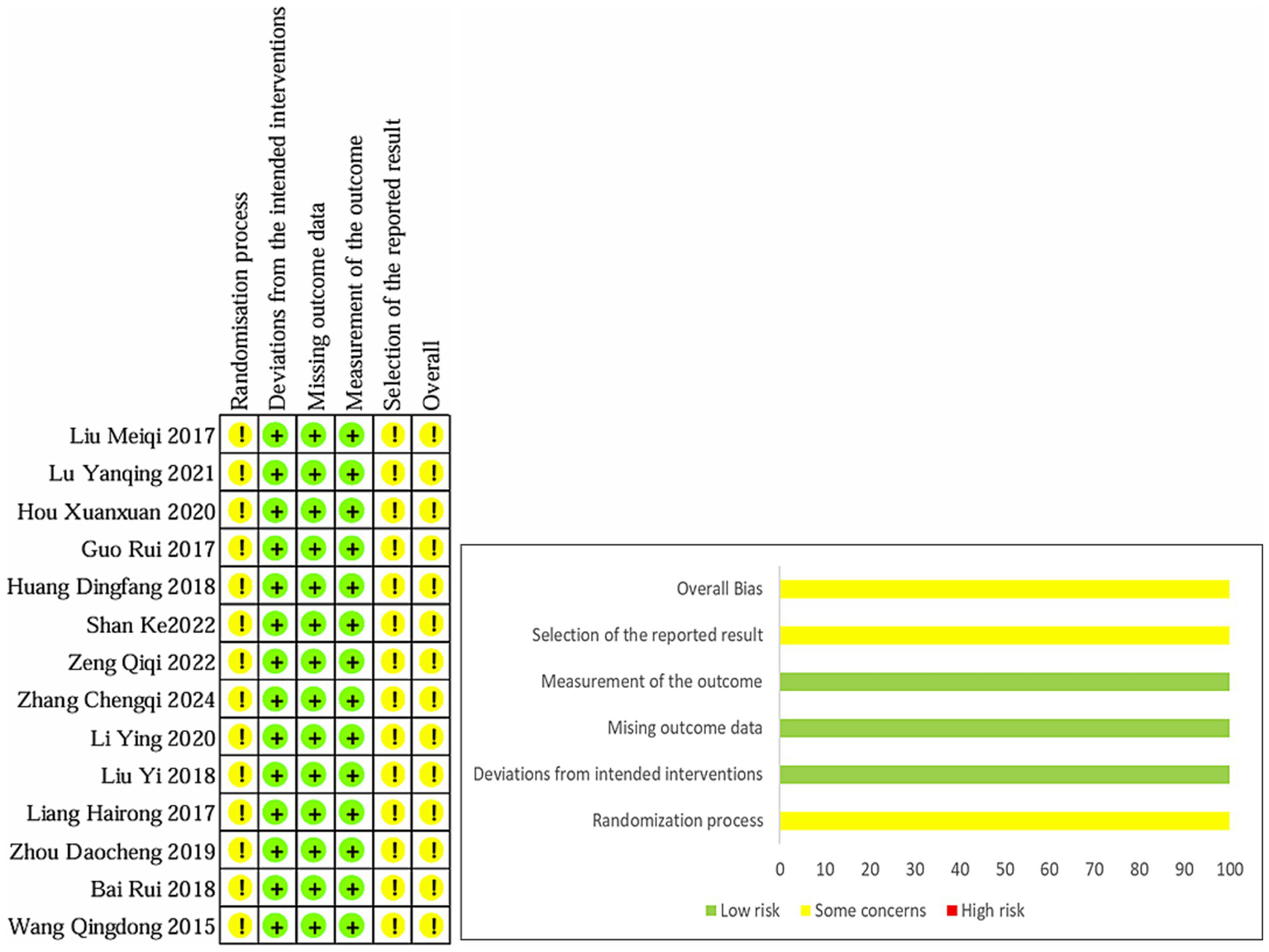 ROB2.0 was used to evaluate the quality of the included literature. All 14 RCTs mentioned random allocation, seven of them (18–20, 22, 23, 25, 26) used randomized numeric tables, one (21) used the order of hospital treatment, and one (24) used the method of treatment. None of the 14 RCTs mentioned blinding, so the bias in the randomization process was rated as “Some concerns.” All literature intervention allocation was rated as “low risk.” All literature was rated as “low risk” with complete outcome data, and all outcome measures were appropriately rated as “low risk.” Due to insufficient evidence to determine the existence of selective reporting of results, all literature was rated as “Some concerns” regarding the potential of selective reporting bias and is detailed in Figure 2.