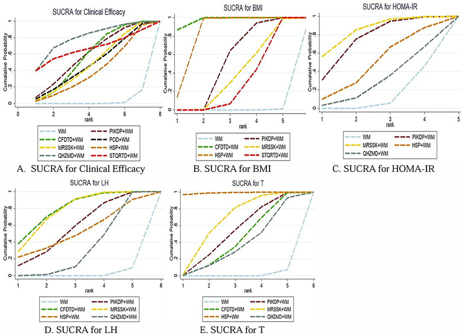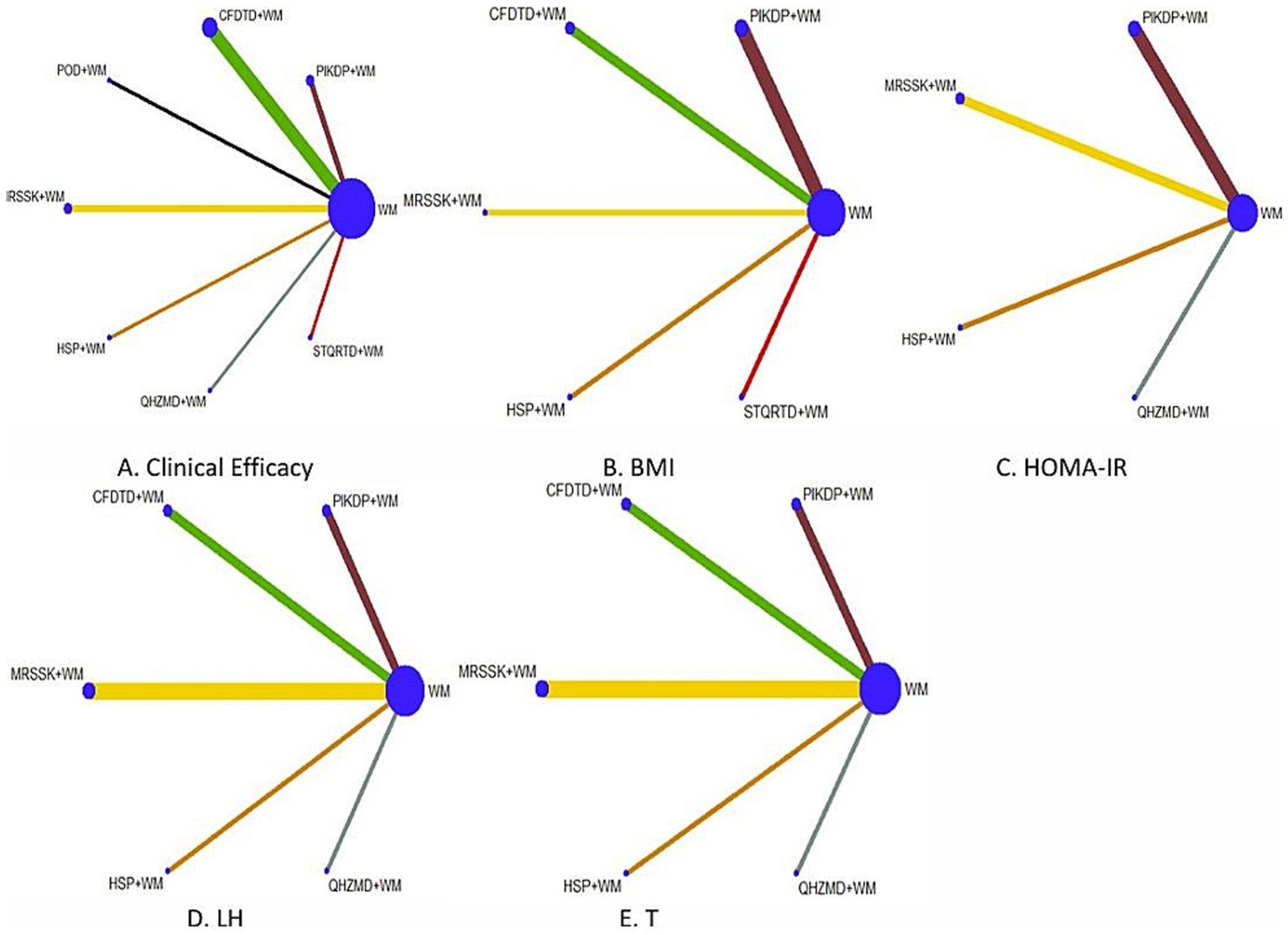 The results demonstrated that PIKDP+WM ( =1.50, 95% CI [0.49, 2.50]), CFDTD+WM ( =1.45, 95% CI [0.86, 2.05]), MRSSK+WM ( =1.29, 95% CI [0.30, 2.28]), and QHZMD+WM ( =2.16, 95% CI [0.57, 3.74]) in the treatment of obese PCOS were better than simple WM treatment in improving the total clinical efficacy rate, and the difference was statistically significant. There was no significant statistical difference between the two interventions (see Table 2).