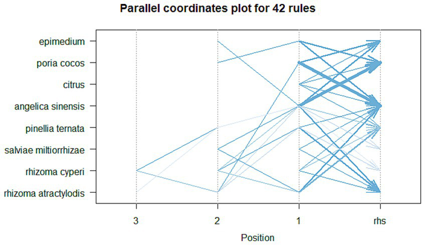 PCOS is a common reproductive endocrine illness in reproductive age. It is characterized by chronic anovulation, polycystic ovarian lesions, and hyperandrogenemia (HA), with clinical manifestations including acne, menstrual disorder, infertility, and hirsutism (1). PCOS incidence has risen sharply with a younger onset trend. Globally, the prevalence of PCOS reaches 6–15% among women of reproductive age (2). A Finnish prospective cohort study showed a significant association between body weight and PCOS symptoms in all age groups (3). Currently, the mechanism of obesity-type PCOS remains unclear, but studies have found that for obesity-type PCOS patients, a mere 5% weight reduction can significantly improve ovarian function, adjust reproductive dysfunction, and correct endocrine and metabolic abnormalities (4). Therefore, WM primarily focuses on reducing weight and improving symptoms, rather than a complete cure. Traditional Chinese medicine (TCM) has no specific terminology for PCOS. It is classified as “infertility,” “abdominal masses,” and “amenorrhea” based on its clinical presentations. The method of invigorating the spleen, replenishing the kidney, and resolving phlegm is a treatment method rooted in the theory of TCM and clinical practice. This study aims to comprehensively evaluate the effectiveness of this method in treating obesity-related PCOS through network meta-analysis and to analyze the herbal prescription regularity using data mining techniques, offering an evidence-supported basis for clinical implementation.
