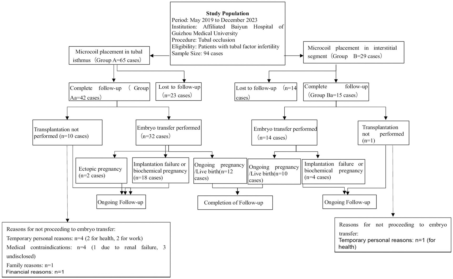 Figure 3. Flowchart of patient selection, tubal occlusion procedure, and follow-up outcomes in the study on tubal factor infertility.