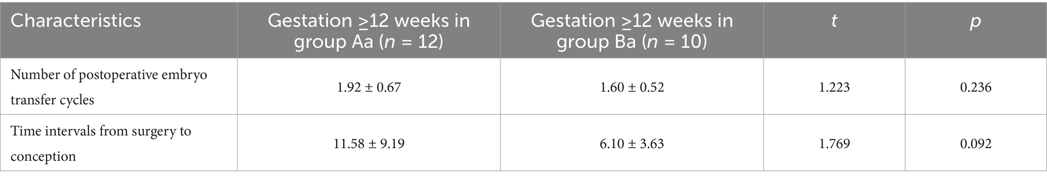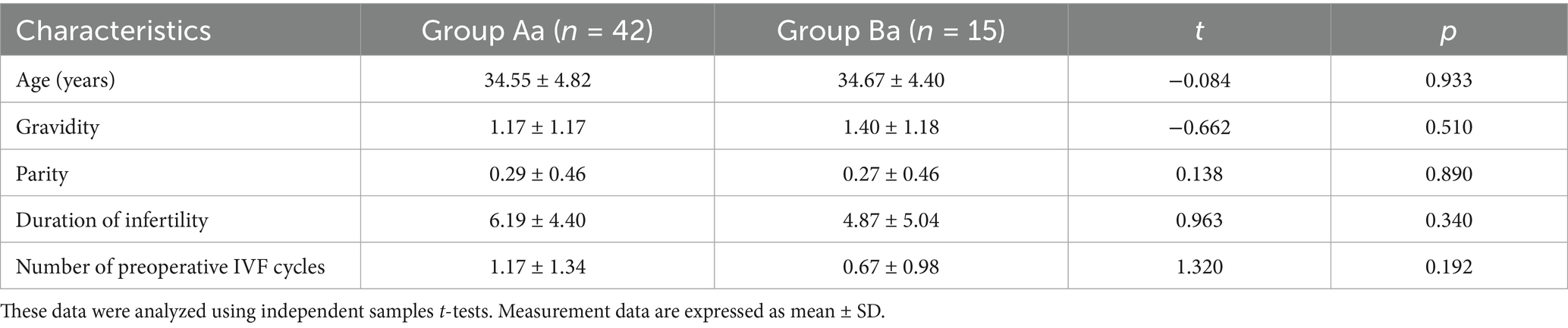After 1–3 years of follow-up, embryo transfer outcomes and IVF cycle data were analyzed in effective respondents (Group Aa = 42, Group Ba = 15). Outcomes included ongoing pregnancies (≥12 weeks), implantation failure, and complications.