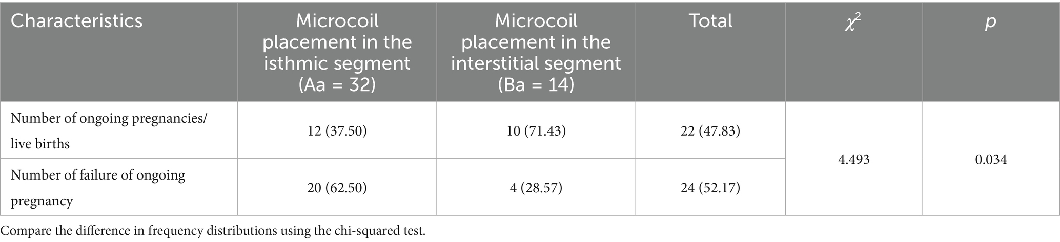 A significant difference was observed between Group Aa and Group Ba in terms of clinically sustained pregnancies and unsuccessful pregnancies (not implanted/biochemical). Specifically, the clinical pregnancy rate in Group Ba was 71.43%, which was significantly higher than the 37.50% in Group Aa (χ2 = 4.493, p = 0.034) (Table 3). Conversely, the rate of unsuccessful pregnancies (not implanted/biochemical) was 62.50% in Group Aa, which was significantly higher than the 28.57% in Group Ba. These findings indicate that the placement of a microcoil into the interstitium (Group Ba) resulted in superior clinical outcomes compared to placement in the isthmus (Group Aa).