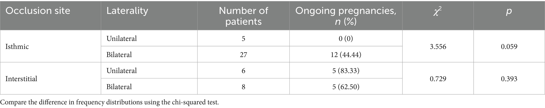 As detailed in Table 4, marked differences in ongoing pregnancy rates were observed within the isthmic occlusion cohort. The unilateral occlusion group demonstrated an ongoing pregnancy rate of 0%, contrasting with 44.44% in the bilateral occlusion group. Although this considerable numerical difference did not reach formal statistical significance (p = 0.059), it suggests a potential clinical trend warranting consideration. Conversely, within the interstitial occlusion cohort, ongoing pregnancy rates were comparable between the unilateral (83.33%) and bilateral (62.50%) groups, confirming no statistically significant association (p = 0.393).
