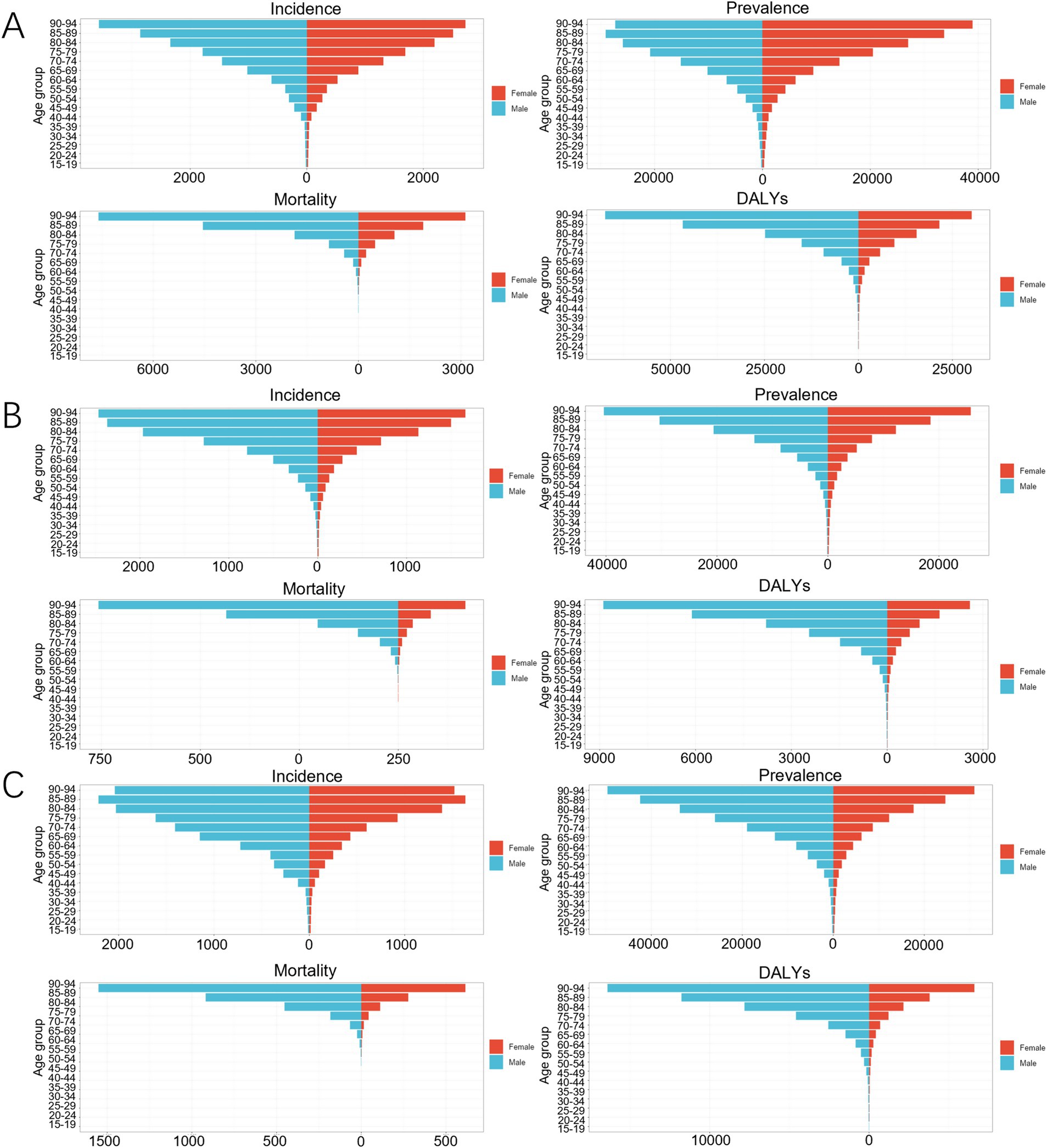 Three panels labeled A, B, and C display bar graphs comparing males and females across age groups for incidence, prevalence, mortality, and DALYs. Blue bars represent males, and red bars represent females. Each panel includes two sets of graphs: incidence and prevalence on top, and mortality and DALYs on the bottom. The horizontal axis measures numbers or rates, while the vertical axis lists age groups from 15-19 to 90-94.
