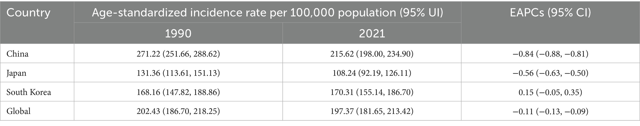 COPD is a heterogeneous respiratory disease primarily characterized by persistent respiratory symptoms and irreversible airflow obstruction (1). In 2019, COPD was reported as the third most common cause of death globally, following ischemic heart disease and stroke. In 2021, due to the deaths related to the Corona Virus Disease 2019 (COVID-19) pandemic, COPD ranked fourth as the cause of death globally, following ischemic heart disease, COVID-19, and stroke (2). Effective prevention and treatment of COPD is a public health concern worldwide. China, Japan, and South Korea are the three largest economies in East Asia, with their total gross domestic product (GDP) accounting for 22.50% of the global GDP and over 99% of the East Asian GDP, as reported in the 2023 statistics (3, 4). China, Japan, and South Korea also have the largest populations in East Asia, together accounting for 19.8% of the global population and 98% of the East Asian population, according to the 2023 data (5, 6). Moreover, Japan was the first country to enter the phase of an aging society in the year 1970, while China and South Korea entered this phase in 2000. All three countries have been facing serious issues related to population aging, which has prompted these nations to continuously improve their medical security and healthcare systems (7). Moreover, China, Japan, and South Korea belong to the Chinese character cultural circle, with Confucianism as the cultural core, which emphasizes family ethics, hierarchical order, and a culture of “harmony” (8). Economically, these three countries have implemented government-led export-oriented strategies, utilizing industrial policies, investment driven by high savings support, and universal education to increase human capital and achieve compressed industrialization, which forms the “East Asian model of growth” (9). A deep understanding of the COPD burden in China, Japan, and South Korea and deciphering the underlying causes and risk factors are crucial for optimizing the public health policies in the region, rationally allocating health resources, and evaluating the effectiveness of intervention measures to reduce the COPD burden in East Asia.
