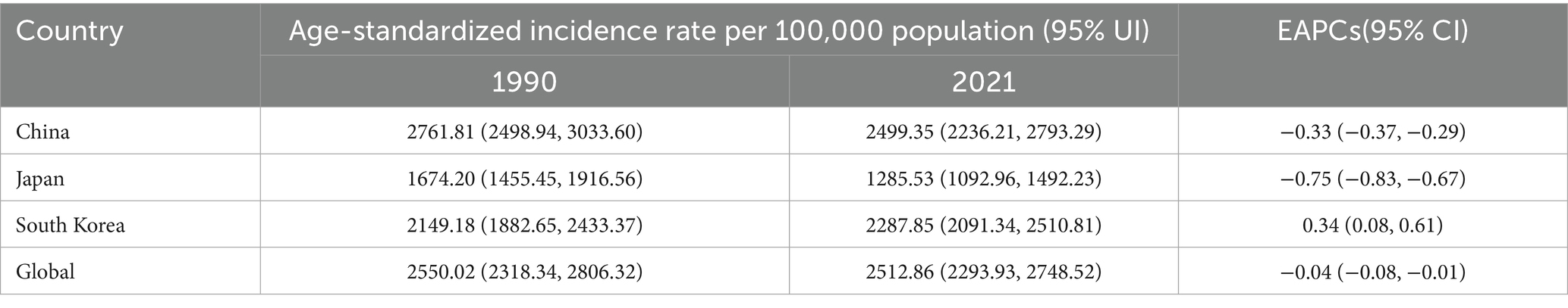 This study utilized the 10th edition of the International Classification of Diseases (ICD-10) to classify the diseases under investigation. The data of respondents from Global, China, Japan, and South Korea were selected for the study. Only the respondents with COPD were selected for data collection. The respondents’ gender was set to male, female, or both. The period of 1990–2021 was selected. The following age groups were chosen: “All ages,” “40–44 years,” “45–49 years,” “50–54 years,” “55–59 years,” “60–64 years,” “65–69 years,” “70–74 years,” “75–44 years,” “80–84 years,” “85–89 years,” and “90–94 years” (11). The estimated annual percentage change (EAPC) was calculated as the annual percentage change of a certain indicator in the time series data by fitting a linear regression model. EAPC is usually used to analyze the change trends in annual health indicators. If the EAPC value is greater than 0 and the 95% CI does not go exceed 0, an average annual growth trend; if the EAPC value is less than 0 and the 95% CI does not exceed 0, an average annual decline trend is indicated (12). Data on the COPD incidence rate, prevalence rate, mortality rate, and DALYs stratified by sex and age group in China, Japan, and South Korea for the year 2021 were summarized. The EAPCs and 95% CIs of the ASIR, ASPR, ASMR, and ASDR in China, Japan, and South Korea between the years 1990 and 2021 were calculated. APC analysis is a statistical method used to study changes in disease burden over time to decompose the impact of age, period, and cohort effects on disease incidence rate and mortality (13). In this study, the APC model was used to estimate the net drifts and local drifts of the age model and determine the rate ratio (RR) of the period and cohort effects. In GBD research, RR is obtained by standardizing the disease burden data in GBD and calculating the numerical ratios. RR is commonly used to compare the relative magnitudes of disease burden rates between different populations or time points to determine the changes or differences in disease burden between different populations or periods (14, 15). The equation for the age-standardized rate is as follows (Equation 1):