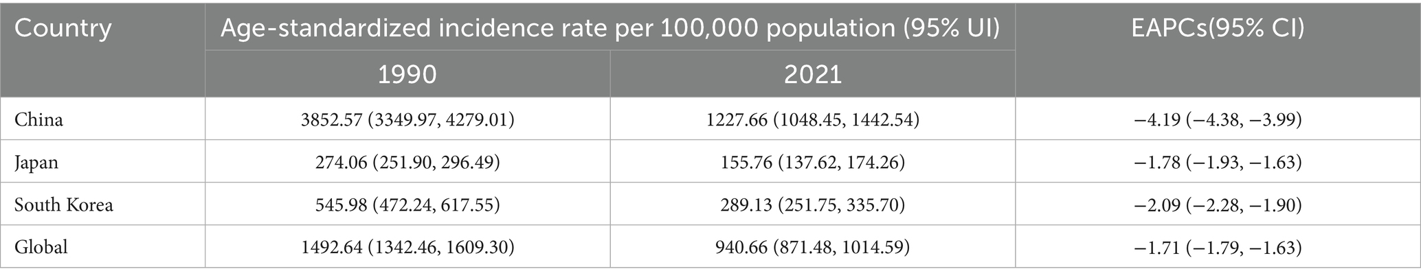 Among China, Japan, and South Korea, China had the highest ASIR of COPD, with a value of 215.62/100,000 (95% UI: 198.00, 234.90) in the year 2021. South Korea ranked second with a value of 170.31/100,000 (95% UI: 155.14, 186.70), while Japan had the lowest value of 108.24/100,000 (95% UI: 92.19, 126.11). From 1990 to 2021, the ASIR of COPD was greater among males than among females in China, Japan, and South Korea. Additionally, from 1990 to 2021, the ASIR in Japan and South Korea was lower than the global average. Compared to that in 1990, the EAPC of ASIR in South Korea was greater than 0 [00.15 (−0.05, 0.35)], and the EAPC of ASIR in China [−0.84 (−0.88, 0.81)], Japan [−0.56 (−0.63, −0.50)], as well as the global average [−0.11 (−0.13, −0.09)], was less than 0, as shown in Figures 1A,B and Table 1.