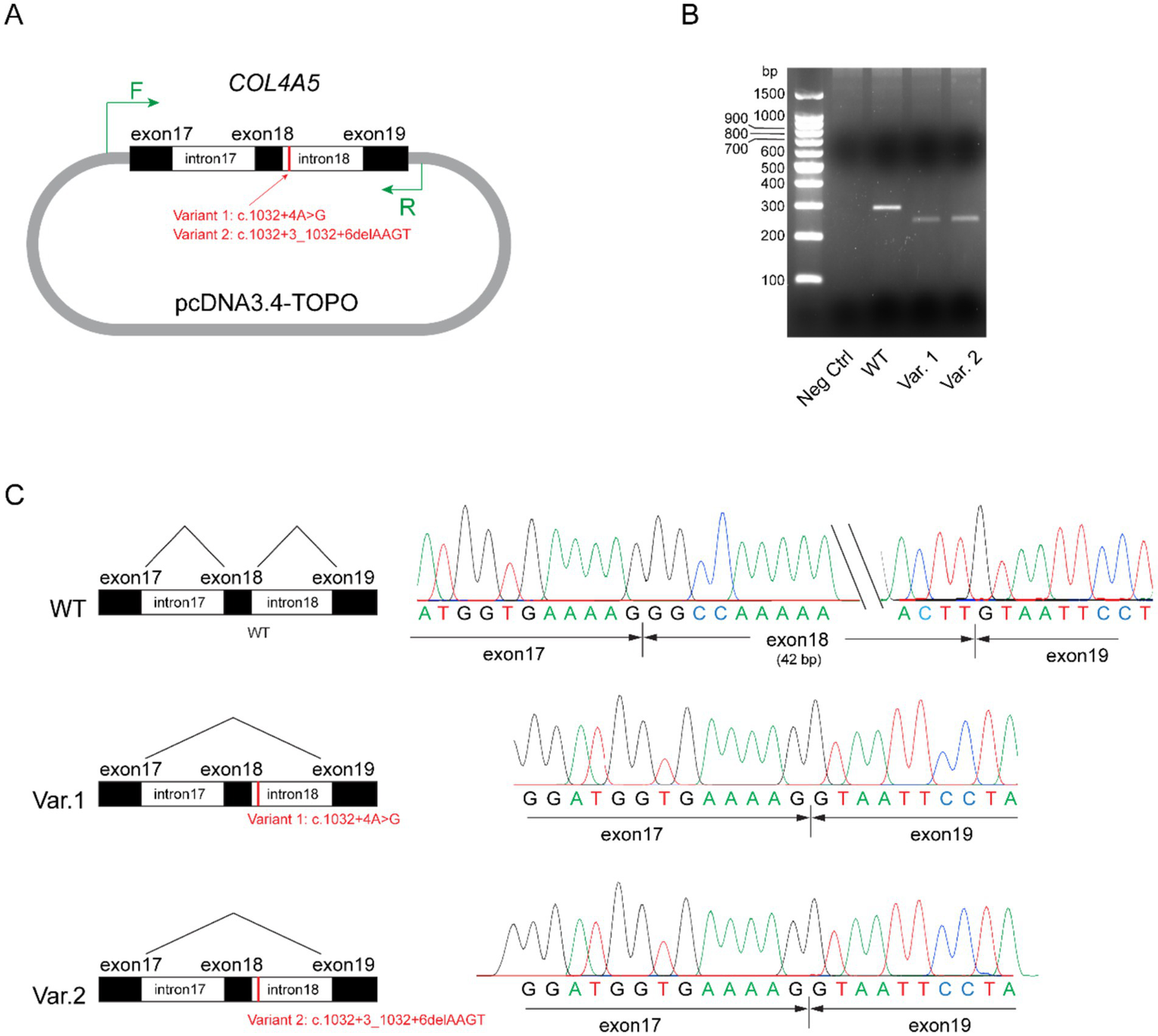 Minigene assay for variants COL4A5: c.1032 + 4A > G and COL4A5: c.1032 + 3_1032 + 6delAAGT. (A) Schematic of the plasmid structures. Exons 17 to 19, together with introns 17 and 18 of the wild-type COL4A5 gene (hg38: chrX-108,582,886-108,586,715), were amplified and ligated into the pcDNA3.4-TOPO vector. The mutant variants (Variant 1: c.1032 + 4A > G and Variant 2: c.1032 + 3_1032 + 6delAAGT) were separately introduced into the control plasmids through site-directed mutagenesis. The short vertical red line marks the variant loci, while the green arrows indicate primer pairs targeting vector-specific regions for polymerase chain reaction (PCR) amplification. (B) Agarose gel analysis of transgene transcripts. Total RNA was extracted from transfected HEK293 cells and reverse transcribed into cDNA. Transgene transcripts were amplified using primers targeting vector-specific regions, with cDNA as the template. While the negative control (pcDNA3.4-TOPO vector) did not yield any observable bands on the agarose gel (lane 2), the plasmid containing the wild-type (WT) form of exons 17 to 19 of COL4A5 produced an intense band approximately 300 bp in size (lane 3). Plasmids harboring Variants (Var) 1 and 2 generated truncated transcripts, as evidenced by faint bands ranging from 200 bp to 300 bp (lanes 4 and 5). (C) Sanger sequencing results of the PCR products. Transcripts from the plasmid carrying the wild-type (WT) sequence included exons 17, 18, and 19 (top panel), whereas transcripts from plasmids carrying Variants 1 and 2 exhibited the skipping of exon 18 (middle and bottom panels, respectively).