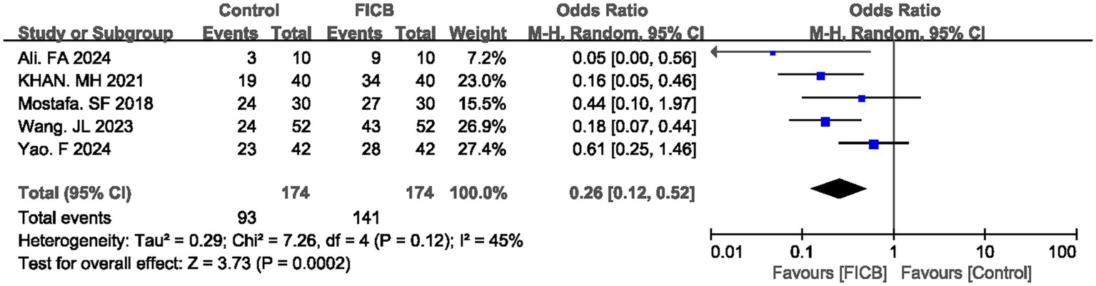 Five studies (16, 21, 24, 33, 40) reported satisfaction rate. No significant heterogeneity was observed in either outcome (p = 0.12, I2 = 45%), justifying the use of a fixed-effect model. The diamond icon to the right of the midline, concurrently labeled “Favours FICB”, and a confidence interval not exceeding “1” indicates that the difference is statistically significant (p < 0.05). Meta-analysis revealed that the FICB group demonstrated both a higher satisfaction rate (OR = 0.26, 95% CI: 0.12 to 0.52; p = 0.0002, Figure 5) compared to the intravenous analgesia group. Outcome level quality for satisfaction rate assessed by GRADE was “Moderate.”