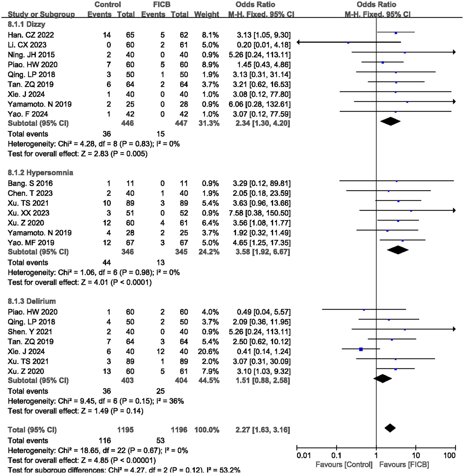 Nine studies (20, 22, 25–27, 31, 35, 39, 40) reported postoperative dizzy rate, seven studies (17, 18, 36–39, 41) reported postoperative hypersomnia rate, and seven studies (26, 27, 29, 31, 35, 36, 38) reported postoperative delirium rate. No significant heterogeneity was observed (dizzy: p = 0.83, I2 = 0%; hypersomnia: p = 0.98, I2 = 0%; delirium: p = 0.15, I2 = 0%), justifying the use of a fixed-effect model. The diamond icon to the right of the midline, concurrently labeled “Favours FICB”, and a confidence interval not exceeding “1” indicates that the difference is statistically significant (p < 0.05). However, for the postoperative delirium rate, the diamond icon is placed on the midline, and the confidence interval crosses “1,” indicating that there is no statistical significance in the postoperative delirium rate between the intravenous analgesia group and the FICB group. Meta-analysis revealed that the FICB group demonstrated both a lower postoperative dizzy rate (OR = 2.34, 95% CI: 1.30 to 4.20; p = 0.005, Figure 6) and hypersomnia rate (OR = 3.58, 95% CI: 1.92 to 6.67; p < 0.0001, Figure 6) compared to the intravenous analgesia group. But for postoperative delirium rate, two groups had no significant difference (OR = 1.51, 95% CI: 0.88 to 2.58; p = 0.14, Figure 6). Outcome level quality for postoperative dizzy rate, hypersomnia rate, and delirium rate assessed by GRADE were “Moderate.”