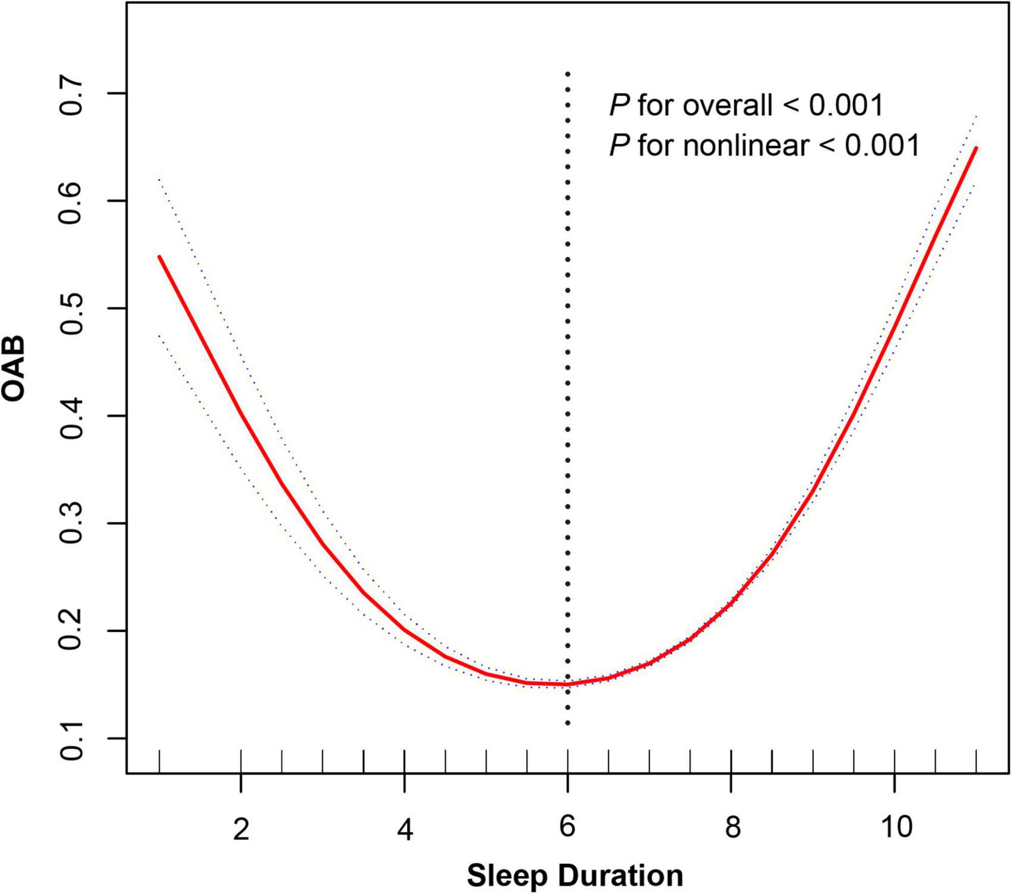 Conclusion: This study reveals a U-shaped relationship between sleep duration and the risk of overactive bladder (OAB), with both short (≤ 6 h) and long (≥ 9 h) sleep durations increasing OAB risk. These findings highlight the importance of sleep management in OAB care. Behavioral interventions, including sleep hygiene education and bladder training, may help mitigate symptoms and improve patient outcomes.
