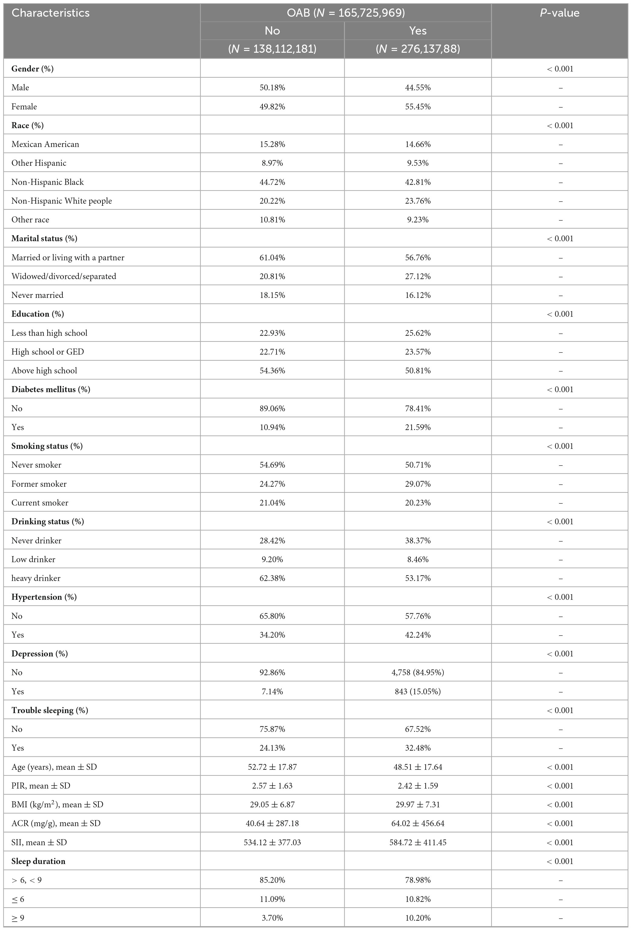 This cross-sectional study included 27,302 U.S. adults (NHANES 2005–2018), with 5,601 (20.5%) diagnosed with OAB. Baseline characteristics demonstrated significant differences between the OAB (N = 5,601) and non-OAB groups (N = 21,701). The prevalence of OAB was highest in the group with sleep duration 6–9 h (78.98%), followed by the group with sleep duration ≤ 6 h (10.82%) and the group with sleep duration ≥ 9 h (10.20%). The OAB group had a higher proportion of females (55.45% vs. 49.82%, P < 0.001) and non-Hispanic White people (23.76% vs. 20.22%). Marital status analysis revealed lower rates of being married/cohabitating (56.76% vs. 61.04%) but higher rates of widowhood/divorce/separation (27.12% vs. 20.81%) in the OAB group (all P < 0.001). Educationally, OAB participants exhibited a higher prevalence of less than high school education (25.62% vs. 22.93%). Chronic disease profiles showed higher diabetes prevalence (21.59% vs. 10.94%) but lower hypertension rates (42.24% vs. 34.20%) in the OAB group. Psychosocial factors indicated elevated rates of sleep trouble (32.48% vs. 24.13%) and depression (15.05% vs. 7.14%) among OAB individuals (all P < 0.001). Behaviorally, never drinkers were more common in the OAB group (38.37% vs. 28.42%). The OAB group was younger (48.51 ± 17.64 vs. 52.72 ± 17.87 years), had higher BMI (29.97 ± 7.31 vs. 29.05 ± 6.87 kg/m2), and elevated SII (584.72 ± 4 11.45 vs. 534.12 ± 377.03) and ACR (64.02 ± 456.64 vs. 40.64 ± 287.18 mg/g) (all P < 0.001). These findings underscore significant associations between OAB and demographic disparities, metabolic profiles, and psychosocial-behavioral factors (Table 2).