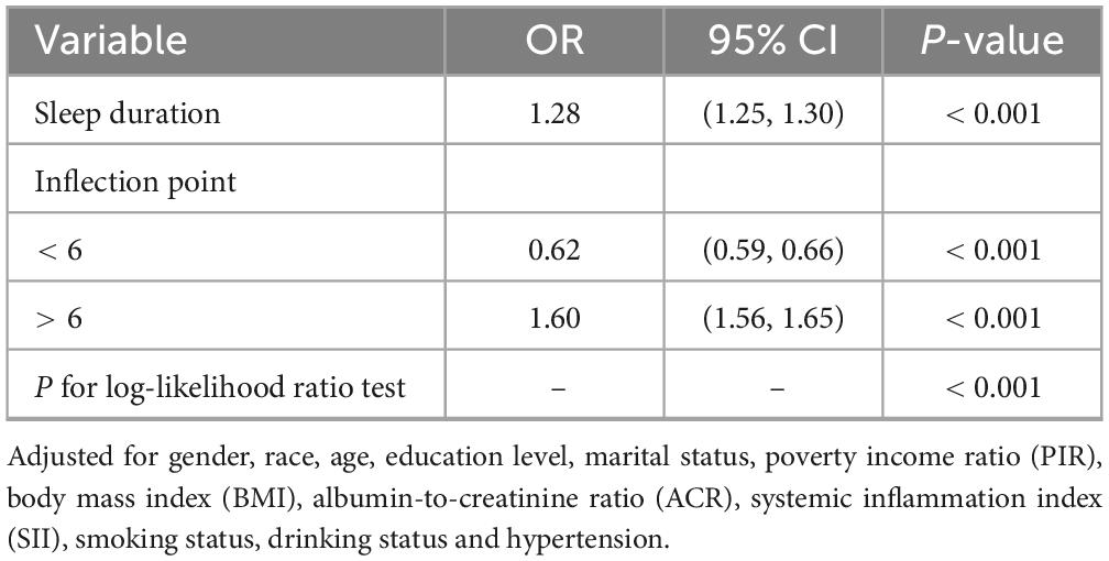 While Table 3 presents results from categorical logistic regression based on predefined sleep duration groups, the evidence for a non-linear U-shaped association was primarily derived from the RCS and threshold effect models (Figure 2 and Table 4). These methods allowed for a more flexible and detailed characterization of risk across the full spectrum of sleep duration—capturing trends that may not be evident in categorical comparisons alone.