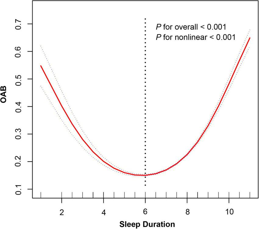 A significant non-linear, U-shaped relationship between sleep duration and OAB risk was observed. Compared to individuals with a sleep duration of 6–9 h, those with short sleep duration (≤ 6 h) had a slightly lower risk of OAB (OR = 0.94), while those with long sleep duration (≥ 9 h) had a significantly higher risk (OR = 2.54). Self-reported sleep disorders independently elevated the risk of OAB (OR = 1.46). RCS analysis identified 6 h of sleep as a critical inflection point.