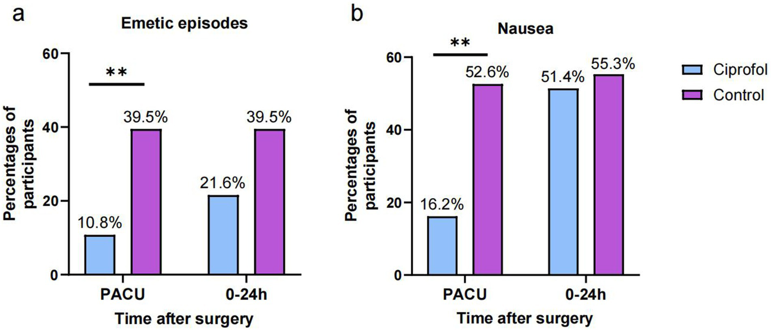 The rates of emetic episodes and nausea in the PACU and during 0–24 after surgery. (A) the rates of emetic episodes; (B) the rates of nausea; Significance was determined by two-tailed X2 test. *p < 0.05; **p < 0.01.