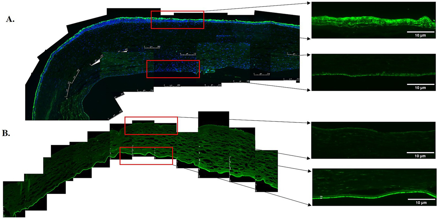 Immunofluorescent staining of elastin in the anterior and posterior corneas of the keratoconus (KC) cases and controls. (A) A representative stitched image of the KC posterior cornea at 10x magnification (left and lower panels) and at 20x magnification (right and lower panels) showing the reduced intensity of elastin (green) in the pre-Descemet layer (Dua’s layer) (PDL/DL) and the Descemet membrane (DM). Increased intensity of elastin (green) at 10x magnification (left and upper panels) and 20x magnification (right and upper panels) was observed in the sub-epithelial region of the anterior cornea, corresponding to the Bowman’s zone. (B) The control corneas showed high-intensity elastin (green) staining in the PDL/DL and DM layers at 10x magnification (left and lower panels) and at 20x magnification (right and lower panels), with no fluorescent staining for elastin (green) at 10x magnification (left and upper panels) and 20x magnification (right and upper panels) in the sub-epithelial region of the anterior cornea. Higher magnification (20x) images were highlighted with a red rectangle for the PDL/DL and DM of the posterior cornea (right and lower panels) and the sub-epithelial region of the anterior cornea (right and upper panels). Magnifications and scale bars: 10x (scale bar = 250 μM) and 20x (scale bar = 10 μM).