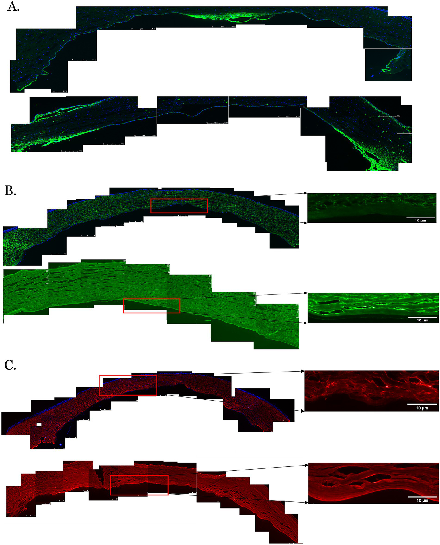 SUPPLEMENTARY FIGURE S3The immunofluorescence staining of elastin protein and its expression in Descemet membrane (DM) at 10x magnification of young cornea donor at ages 34 (A), 39 (B) and 45 (C).