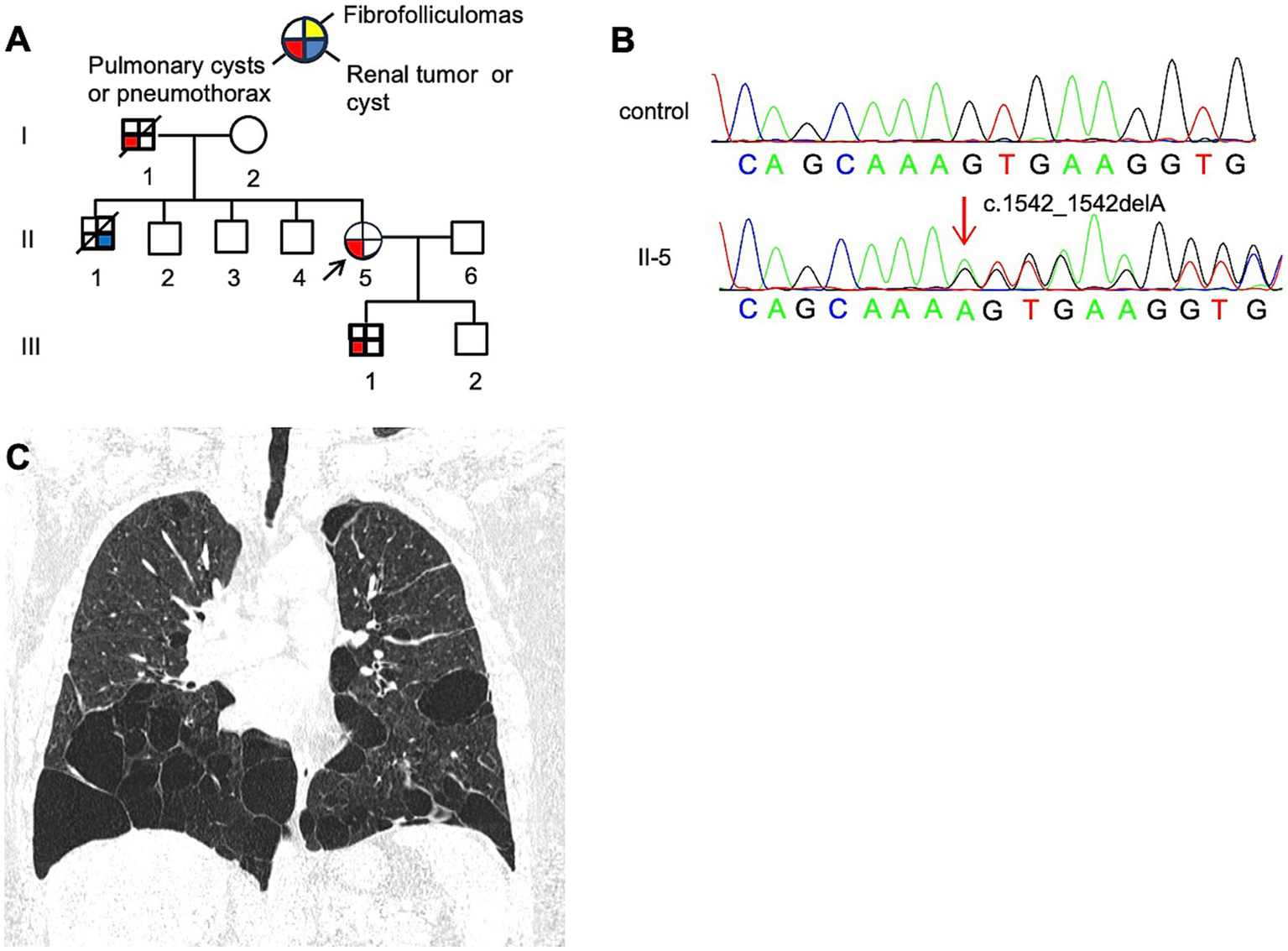 (A) Pedigree of the patient’s Family 3. Generations are identified by Roman numerals and individuals with Arabic numbers. Squares indicate male family members; circles indicate female members; and arrow indicates the proband. (B) Sanger sequencing of FLCN confirmed a mutation (c.1542_1542delA). (C) Lung CT testing result of proband in Family 3.