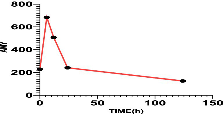 The serum amylase value on the first day after admission was 228 U/L, 6 h later was 684 U/L, 12 h later was 508 U/L, 24 h later was 241 U/L, and 120 h later was 125 U/L.