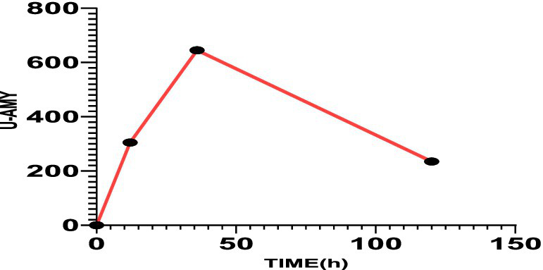 The value of urinary amylase was 305 U/L after 12 h, 645 U/L after 30 h, and 235 U/L after 120 h.