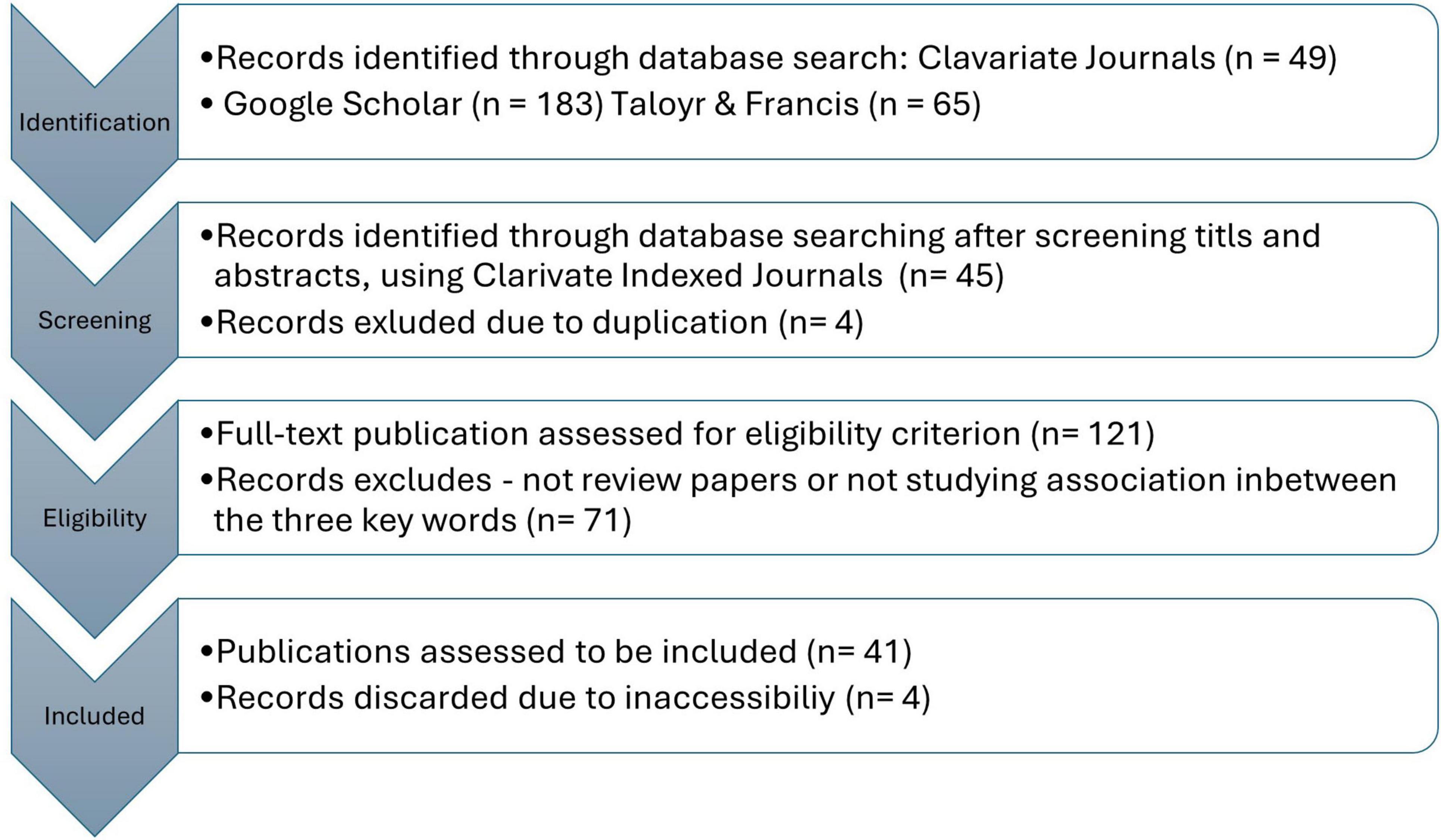 This review employs a two-phase sampling process using the Journal Citation Reports© and related indices. This strategy ensures a focus on high-impact, peer-reviewed studies, though including non-Western databases could enhance the representativeness of findings.