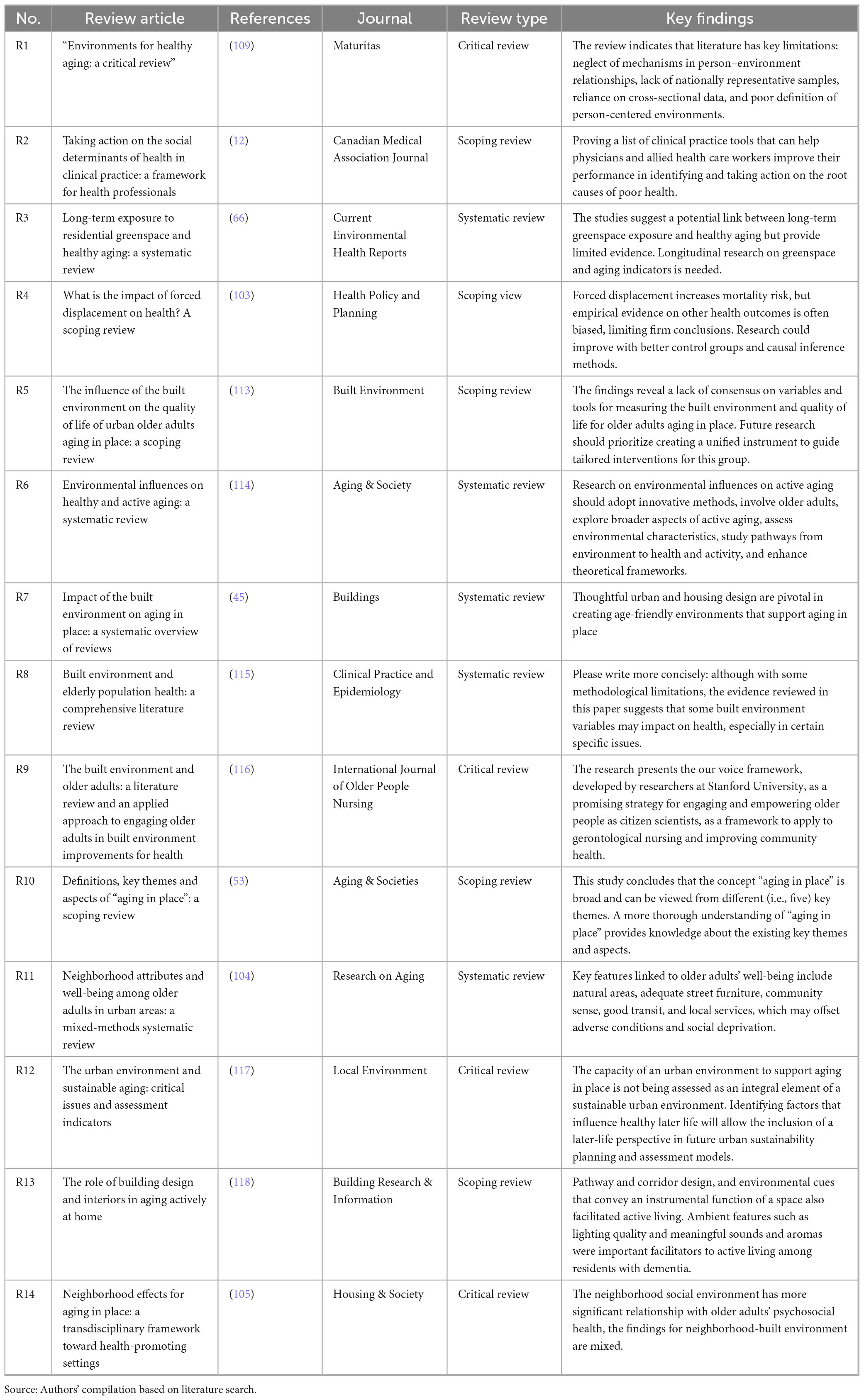 The existing body of literature reviews strongly focuses on at least two of the three key themes–“post-industrial cities,” “environment,” and “healthy aging.” Following the screening process against predefined eligibility criteria in Figure 2 and Table 2, 14 literature reviews are selected for analysis: